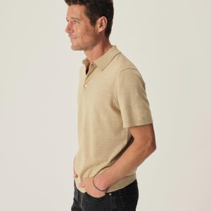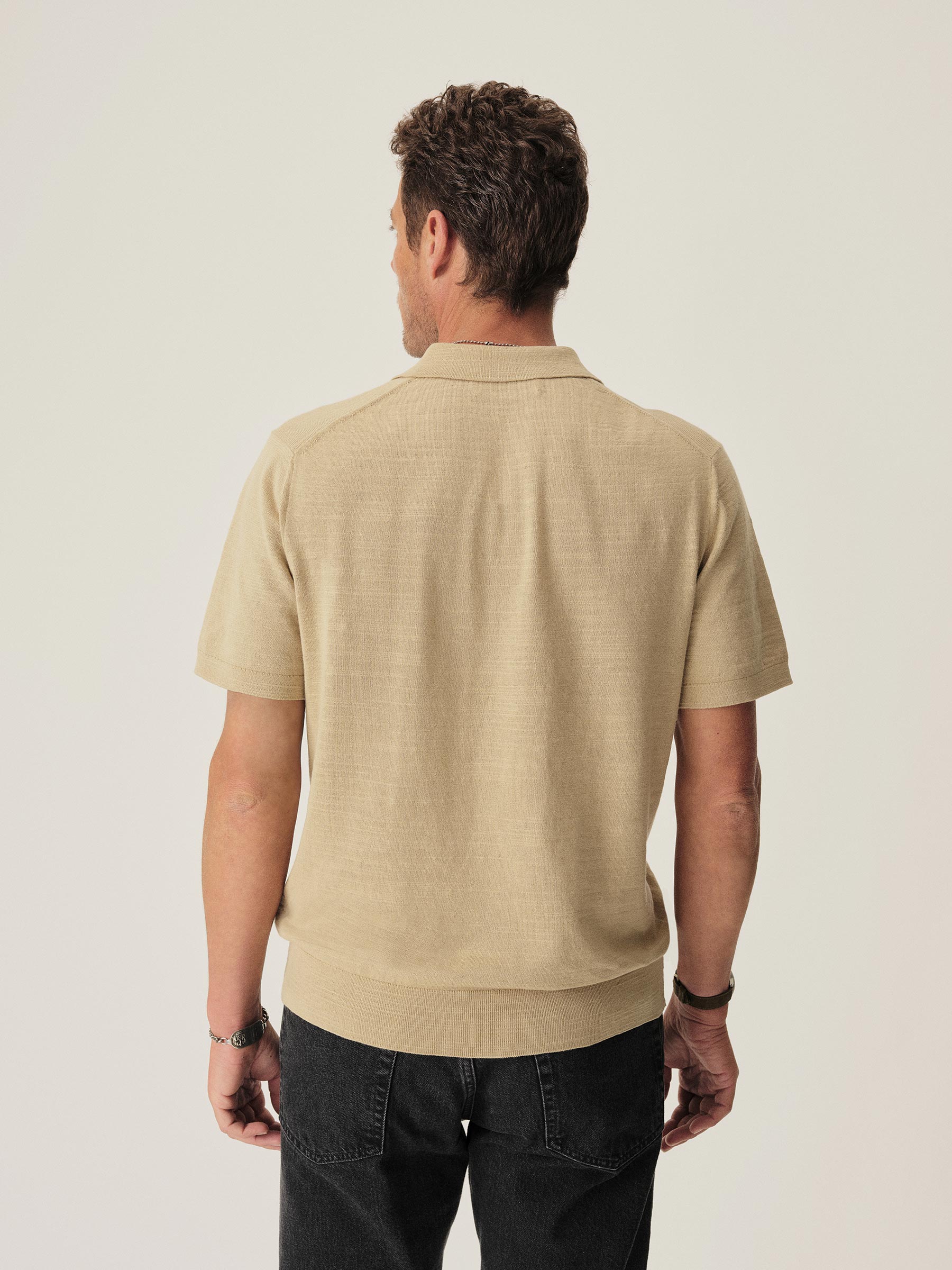 Classic fit sweater polo in yarn-dyed 16 gauge cotton jersey with light slub texture. Features a three-button closure and rib finishing at the cuffs and hem. Constructed with hand-linked seams for improved durability.