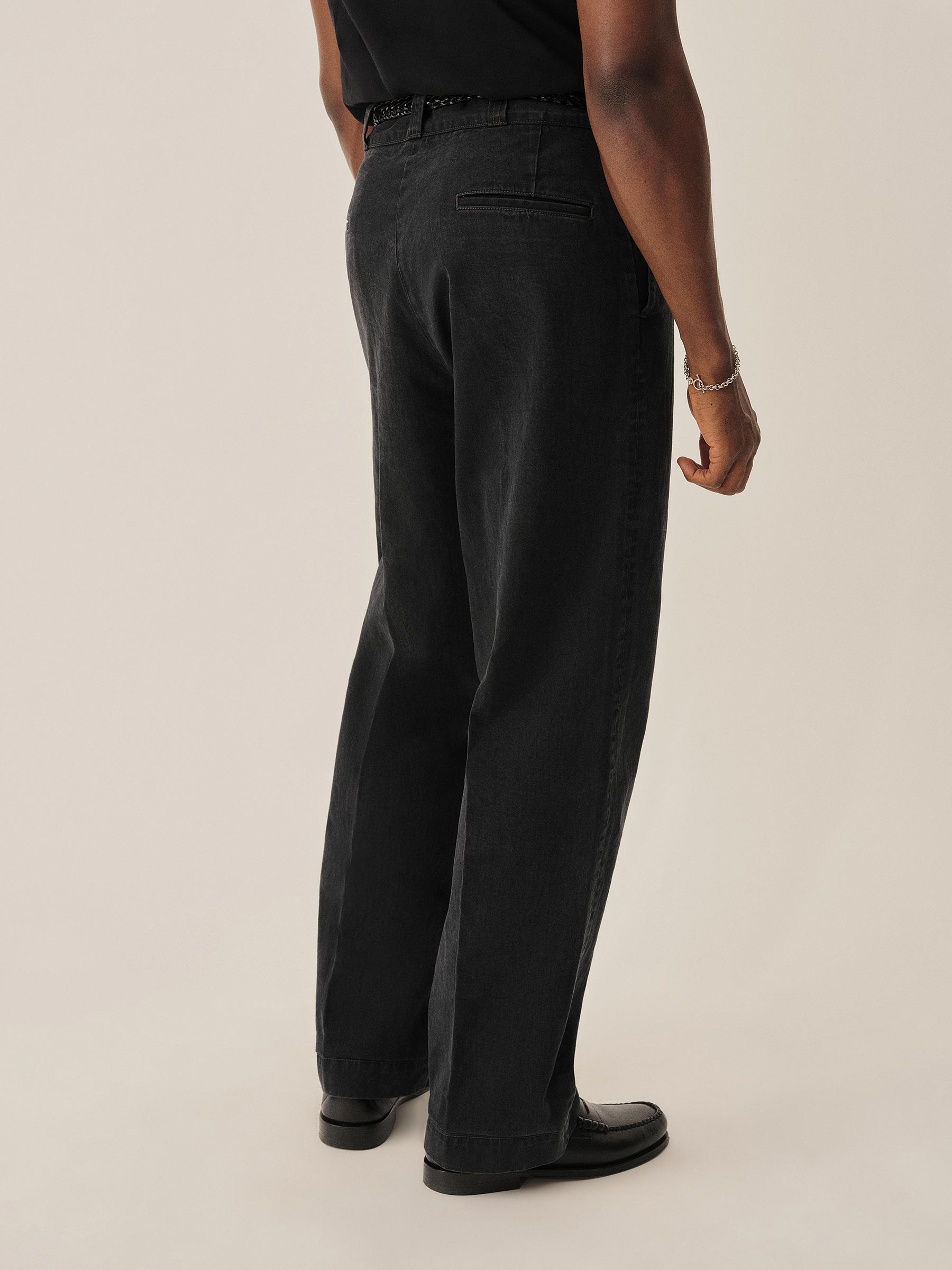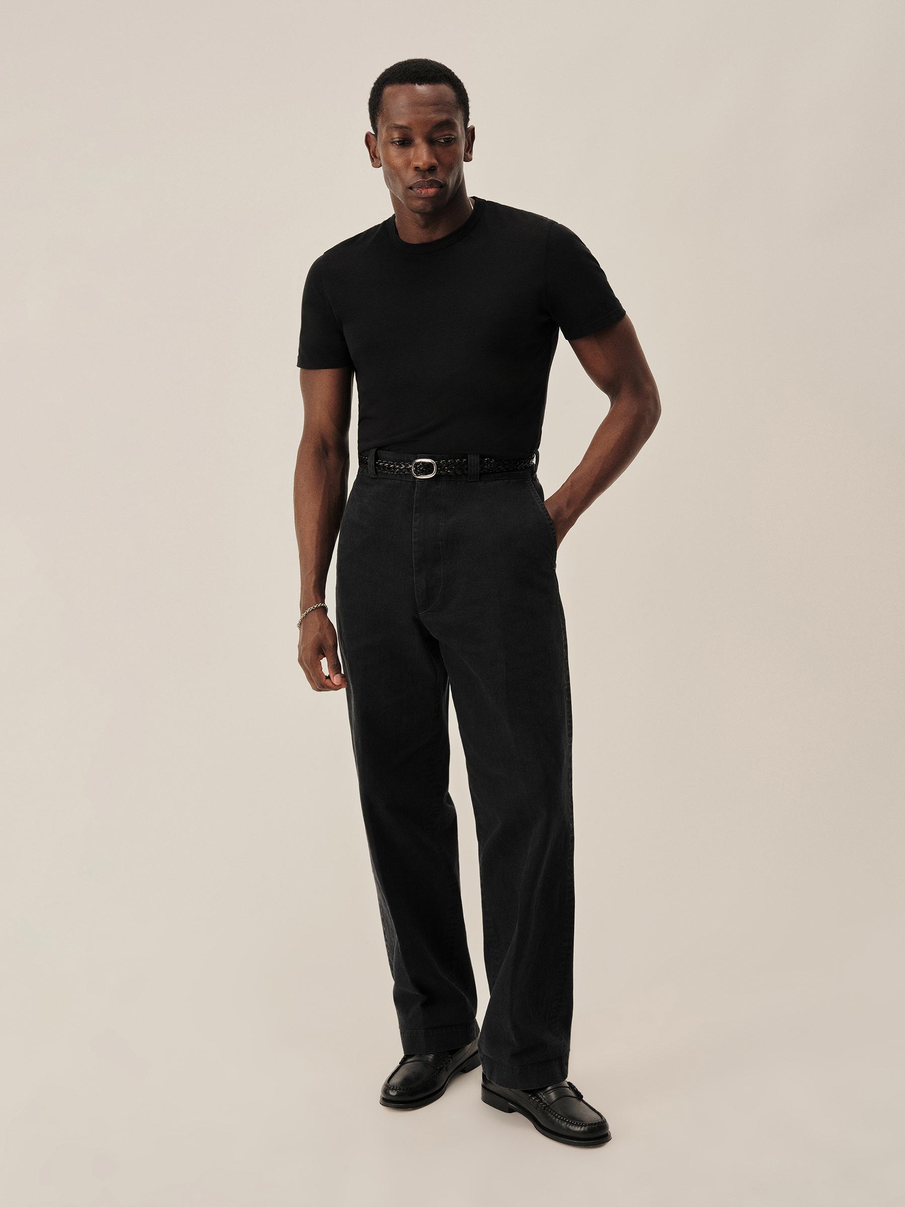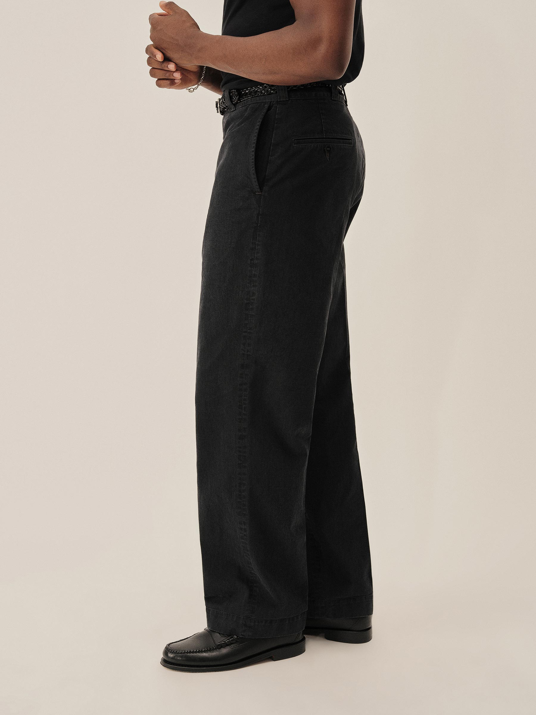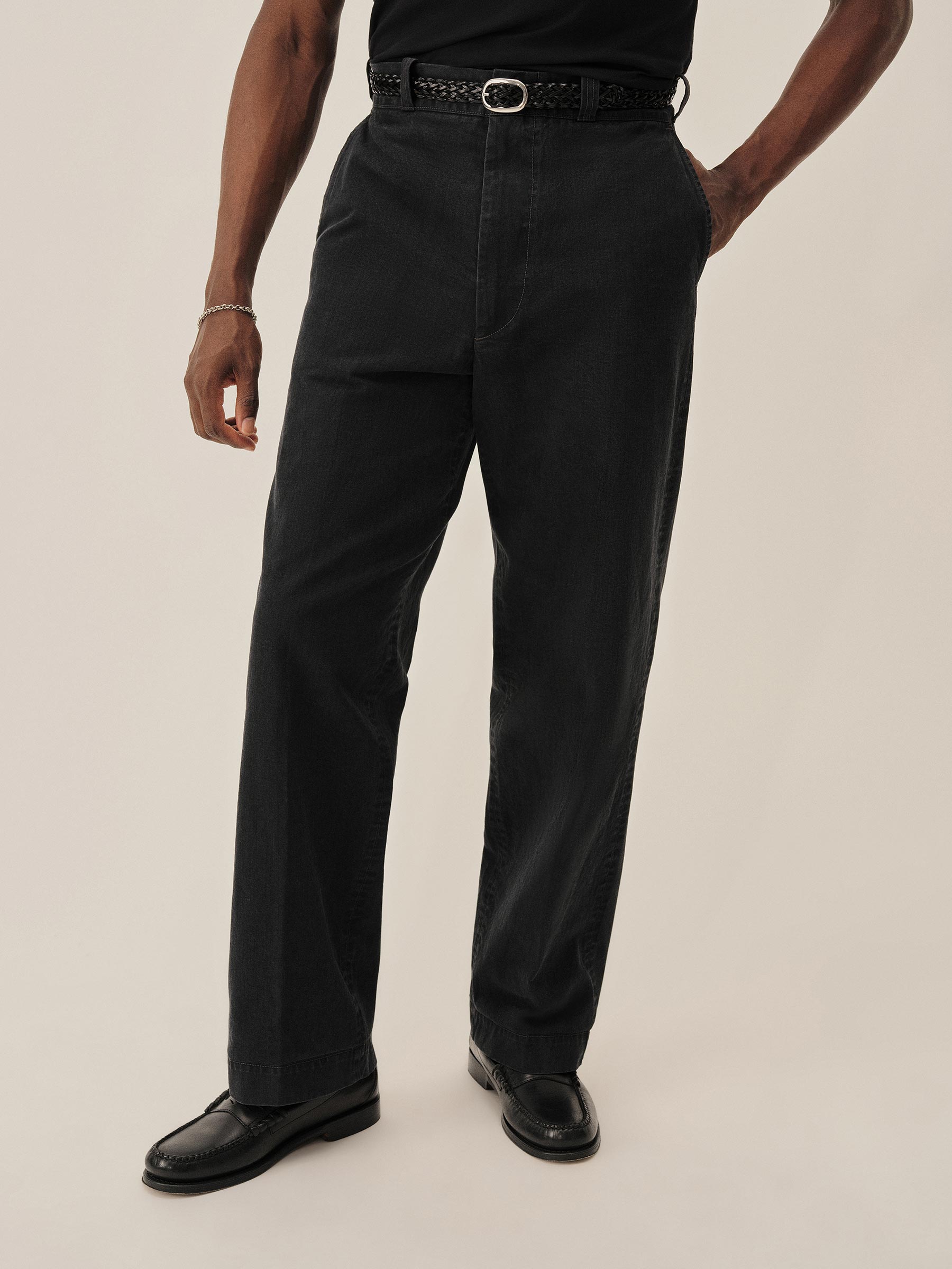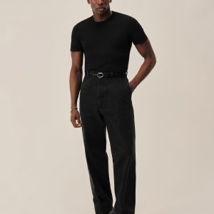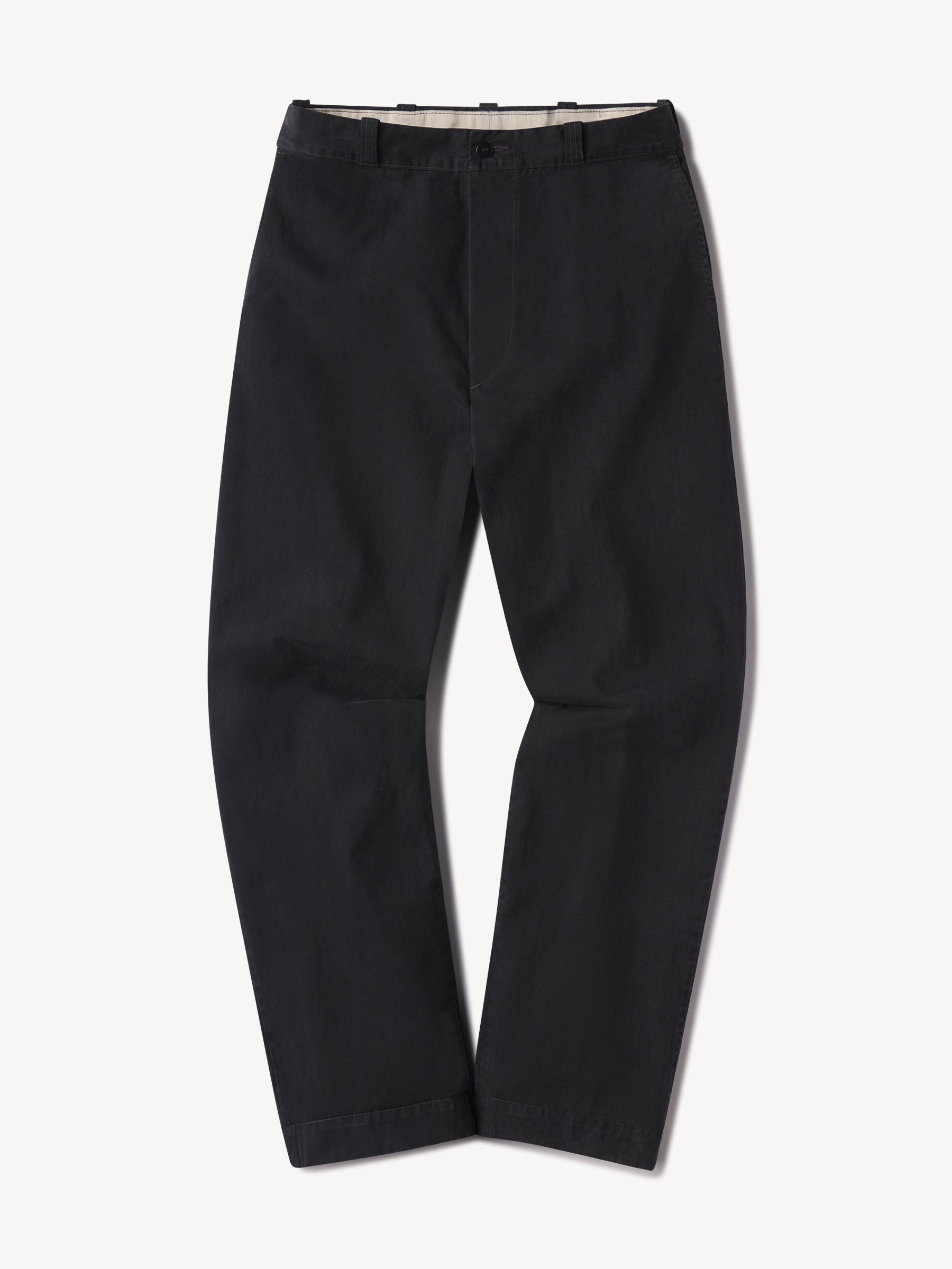 Inspired by 1960s military-issued chinos, an authentic period silhouette with a high rise, full top block, and a full leg. Cut from sulfur-dyed Japanese twill and constructed with busted seaming at the back rise, inseams, and outseams, along with tunnel belt loops and single-welt back pockets. Finished with corozo buttons, a Talon 42 zip, and a zip fly Stonewashed for a lived-in look and feel.