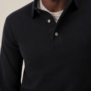 Slim fit long sleeve sweater polo in a 16 gauge jersey knit from yarn-dyed long staple cashmere. Details include a three-button placket with shell buttons and ribbing at the cuffs and hem. Constructed with hand-linked seams for durability.