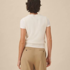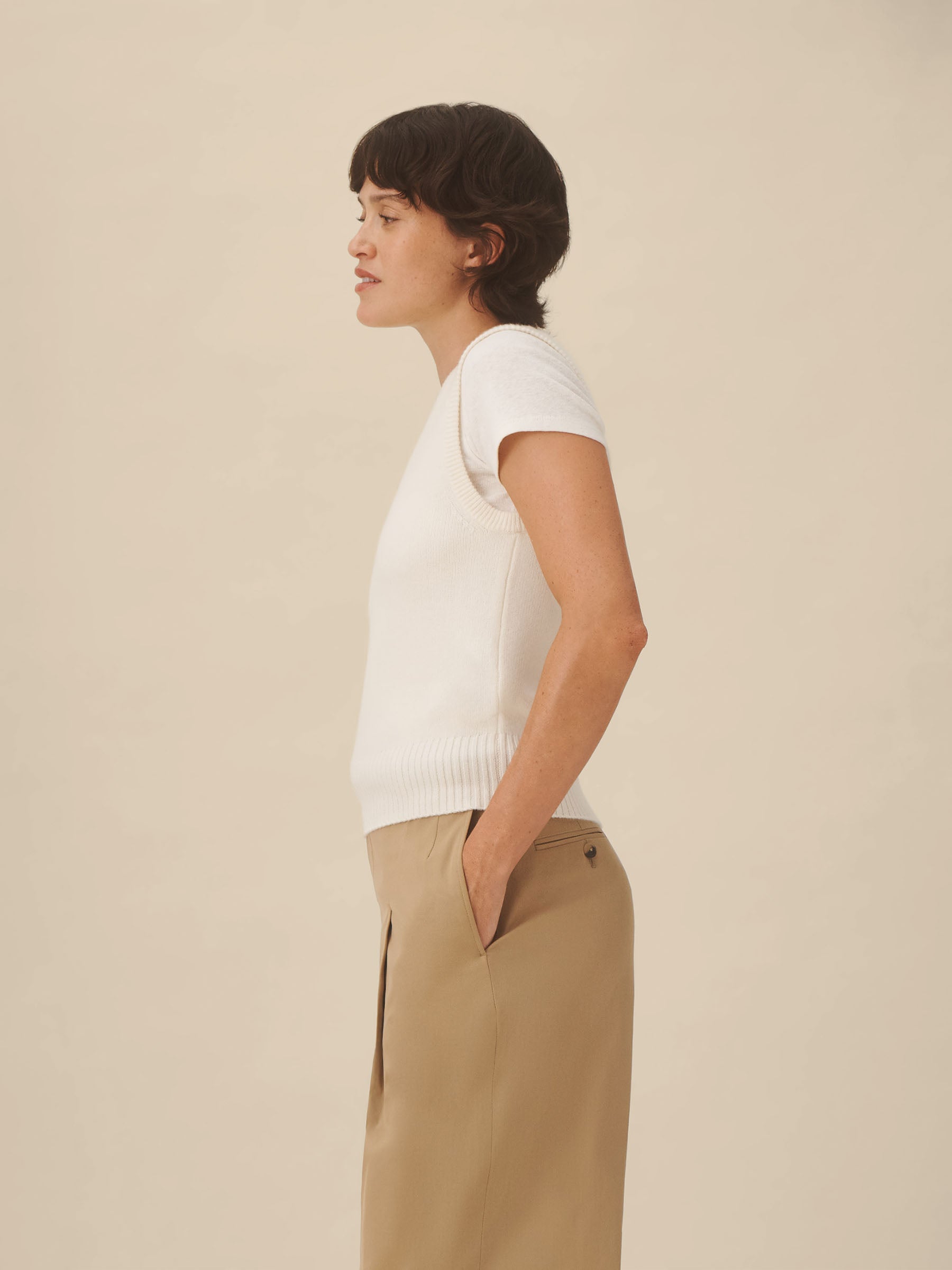 Inspired by vintage military knits, this sleeveless sweater is crafted from 100% cashmere with an airy, soft hand and clean jersey stitch throughout. Finished with rib trims at the neckline, armholes, and bottom band.