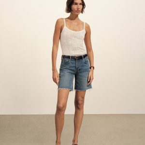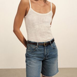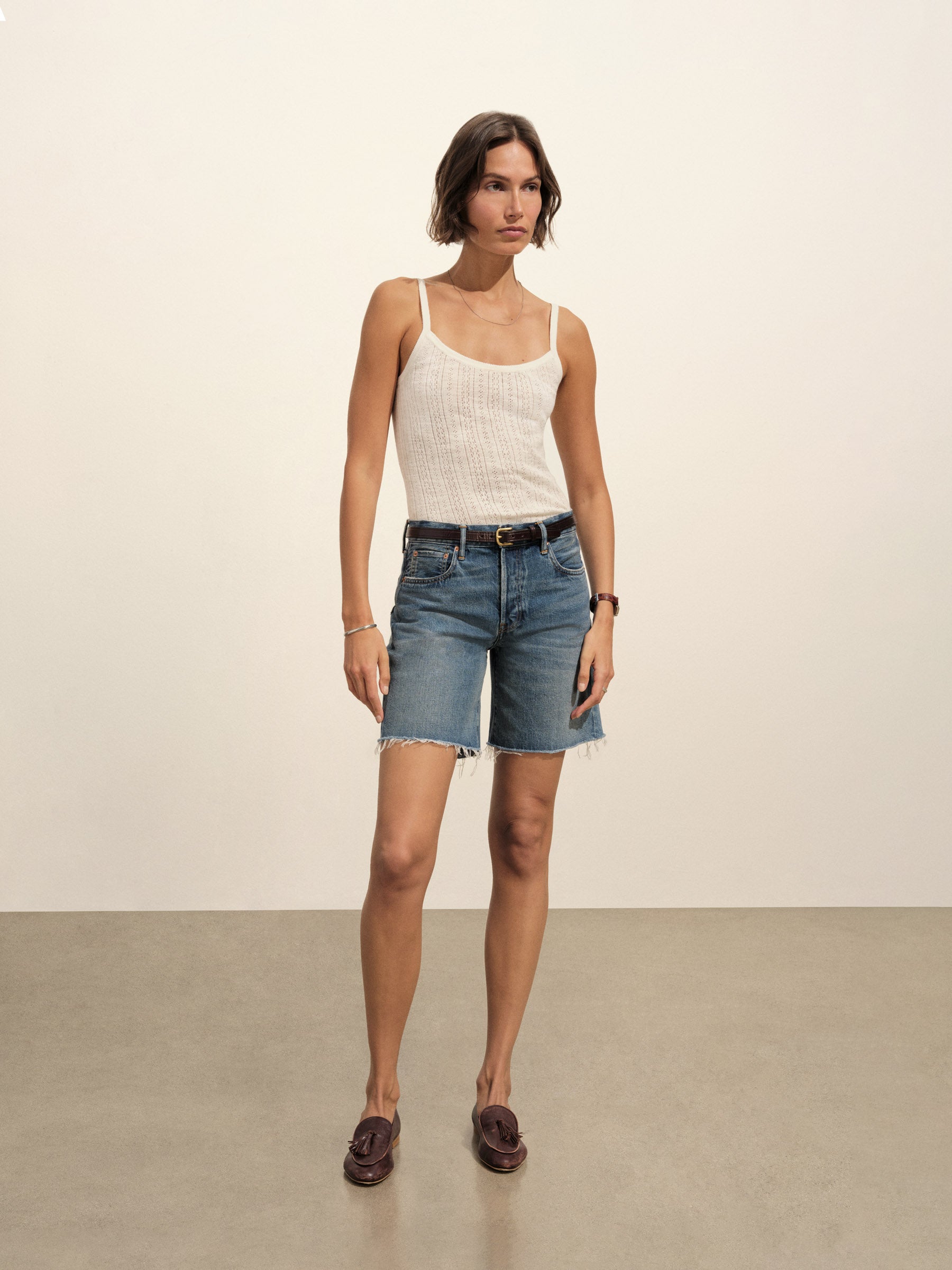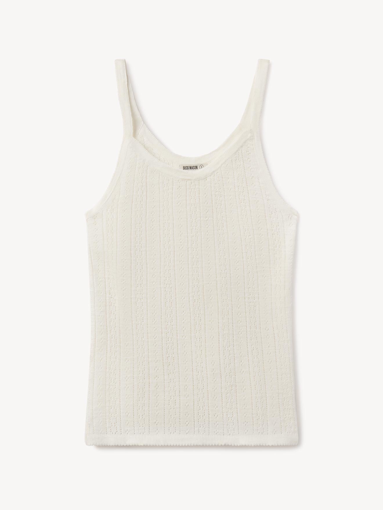 Slim-fit, vintage-inspired scoop camisole crafted from a blend of Italian cotton and linen in an airy pointelle knit. Constructed from a structured 4×2 rib with a textured hand and touch of stretch. Featuring scalloped edge detailing throughout. Garment washed for vintage look and feel.