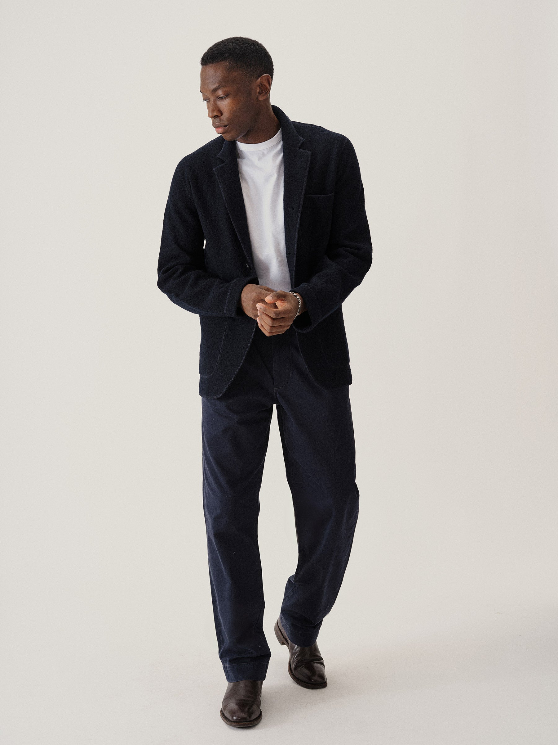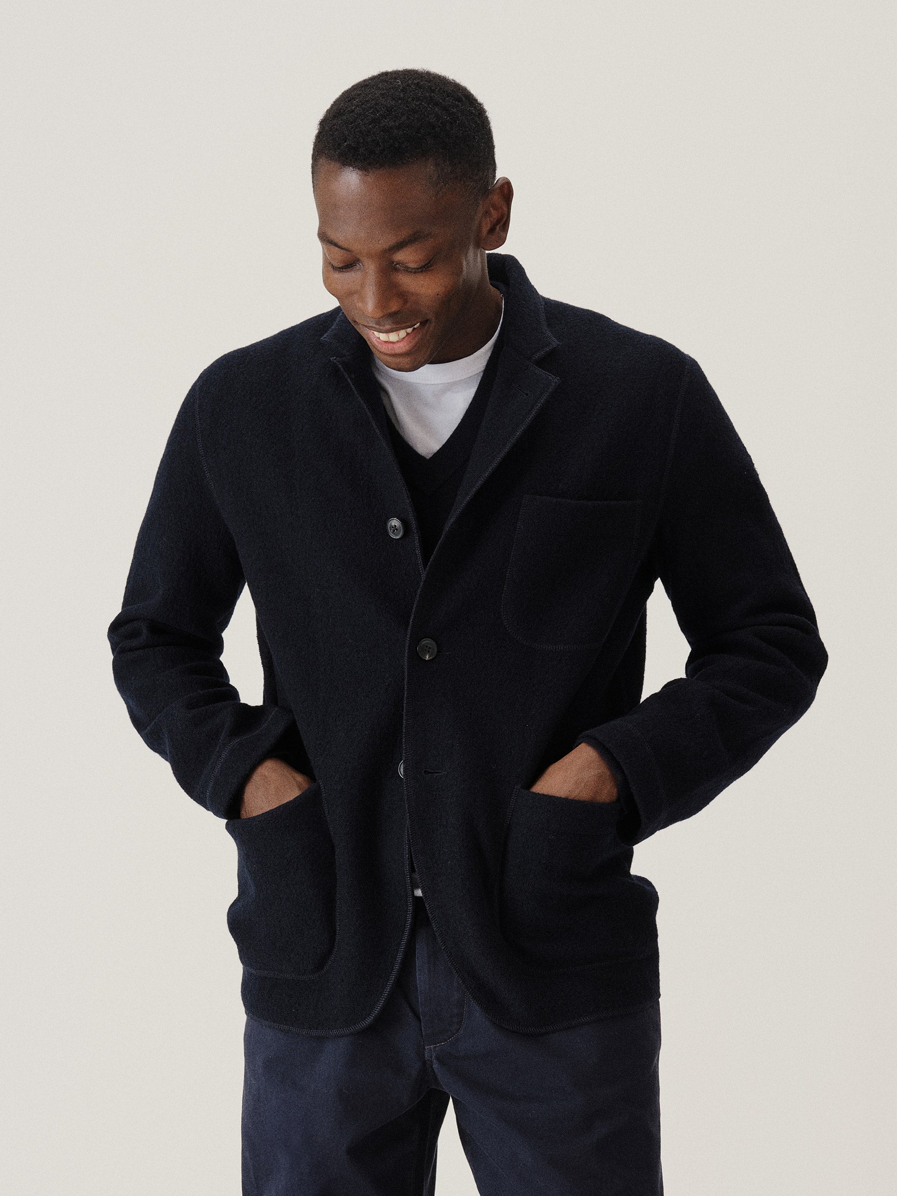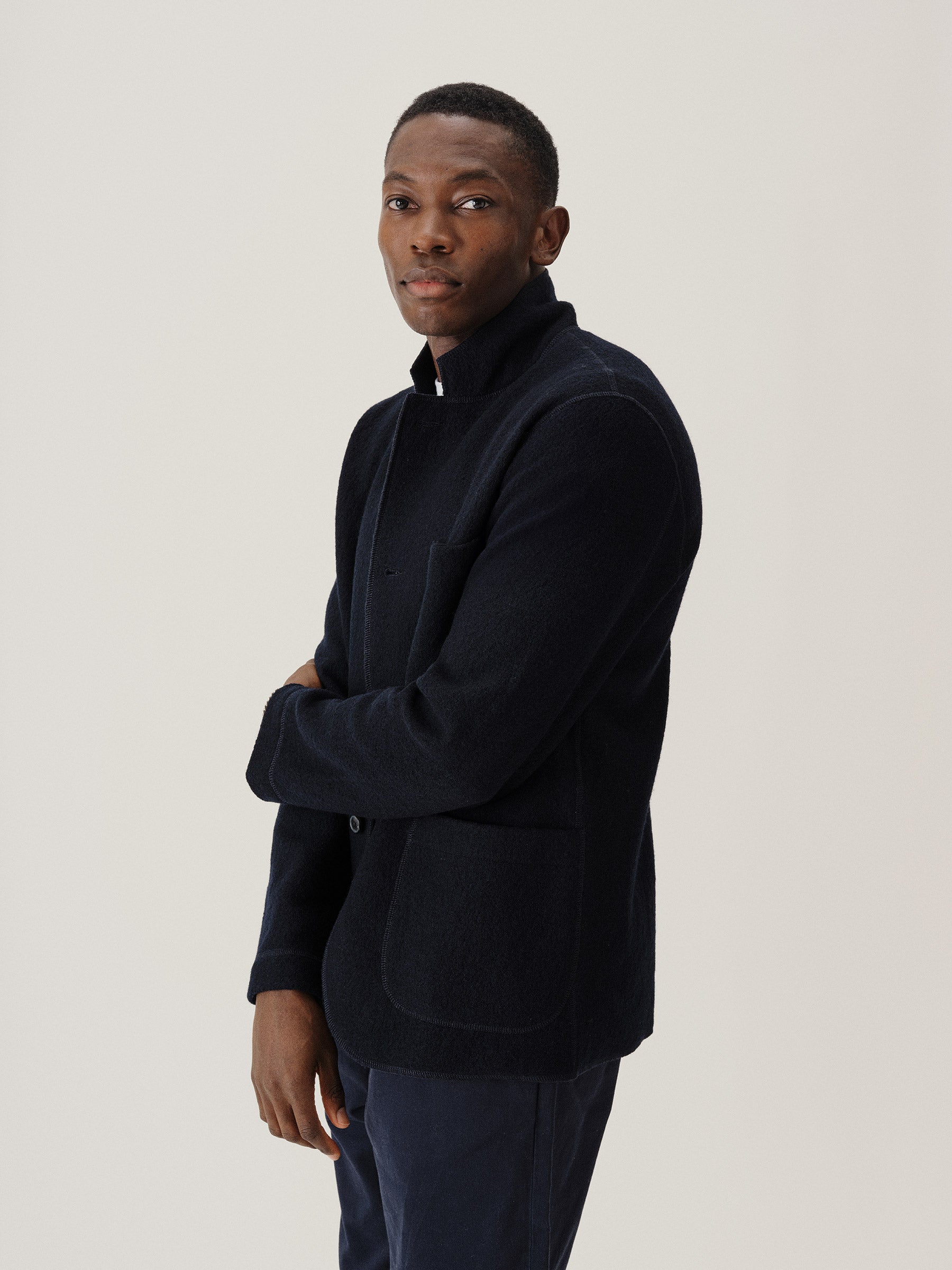 Classic fit chore coat with a slimmer cut through the arms and room in the torso for layering. This 340 GSM felted merino wool has been twice boiled for improved insulation and durability. Details include three patch pockets, real horn buttons, and a notch collar. Constructed with hand-sewn facings and cover-stitching throughout.