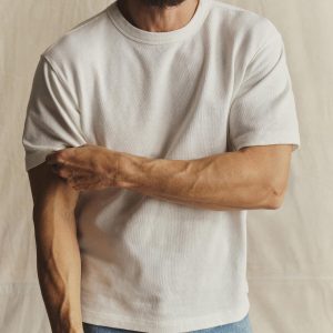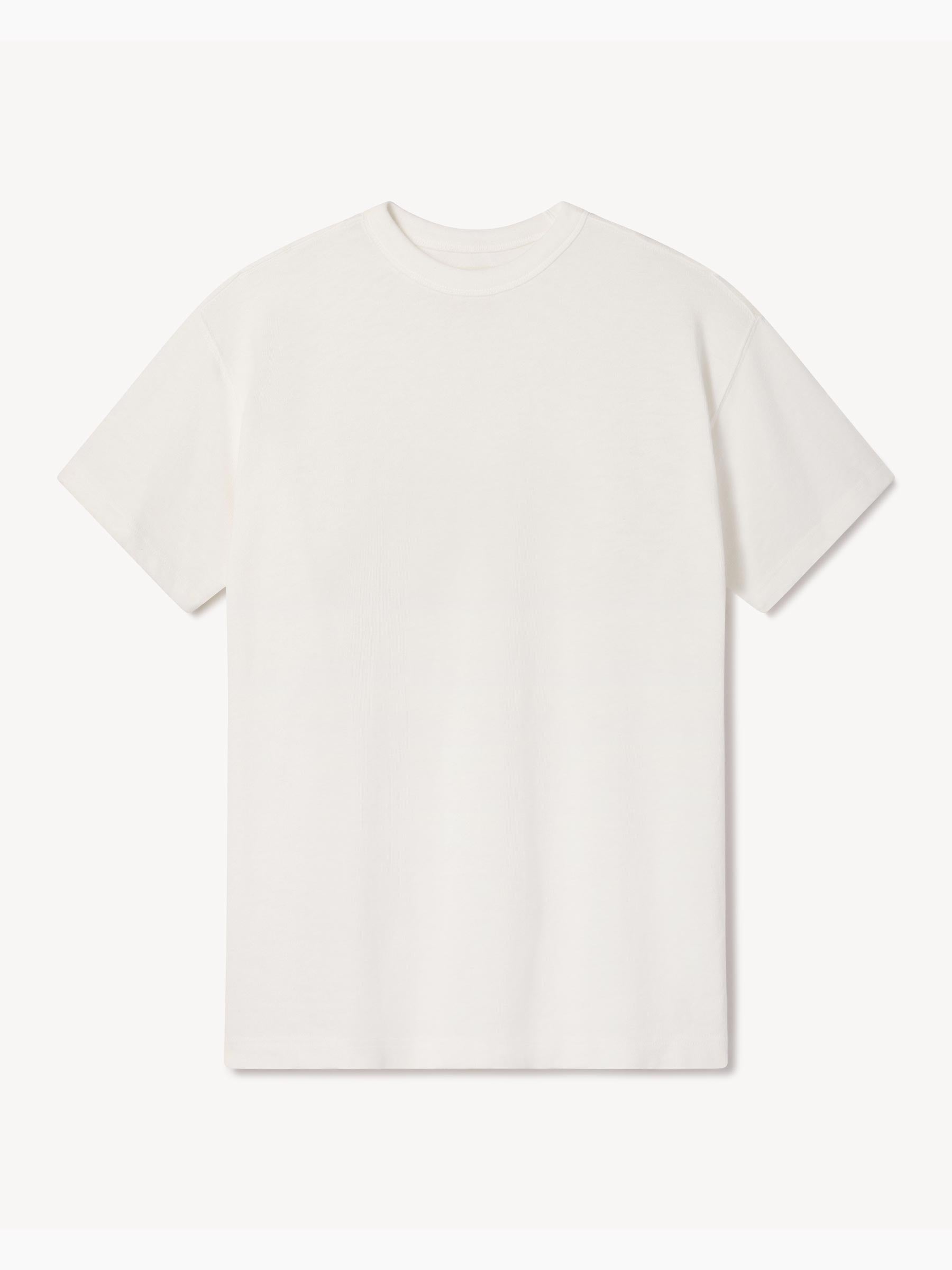 Cut from a substantial and soft, 310 GSM cotton jersey, this 90s-inspired boxy crewneck tee has a straight hemline, longer sleeves that hit lower on the bicep, and a wide-ribbed collar. It features a bound neck with a woven label, and is constructed with a split-needle cover stitch at the shoulders and armholes. Double-washed for a soft, smooth texture and a consistent fit.