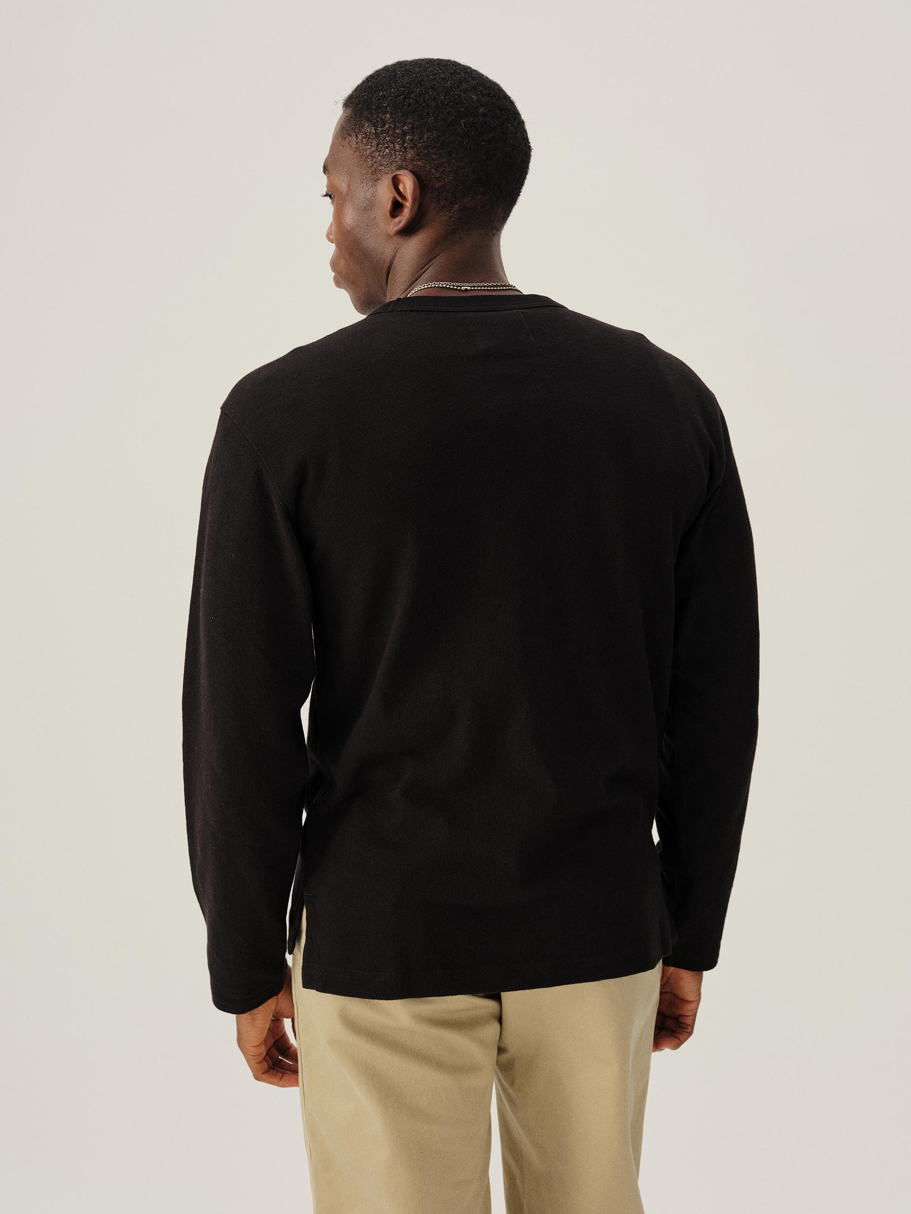 A relaxed, long-sleeved, heavyweight cotton tee modeled after a vintage rugby shirt. The soft cotton jersey is about twice as heavy as our Pima tee, with tiny vertical ribs that gently glide across the skin. This is a solid, substantial stand-alone tee for cold weather.