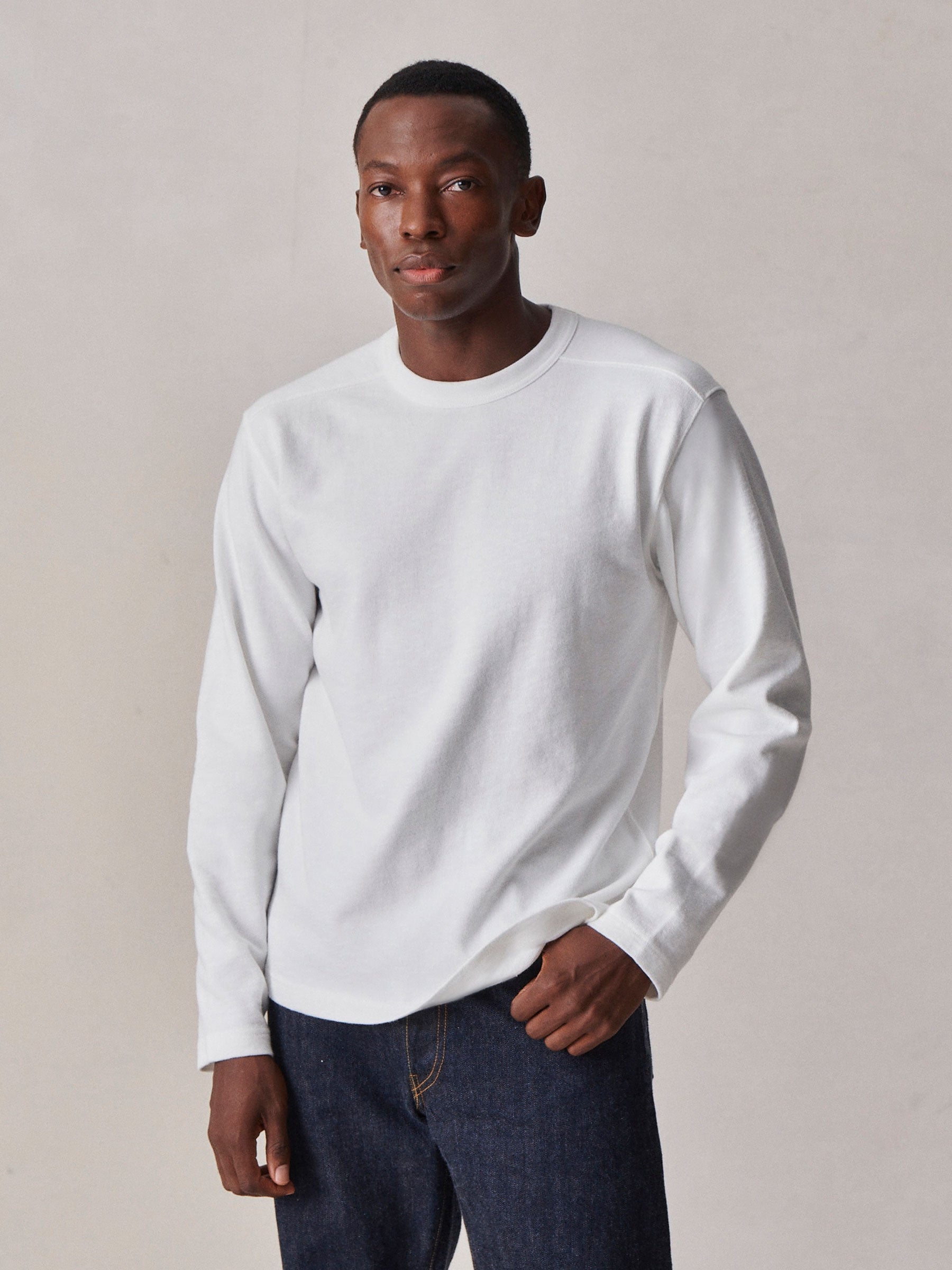 A relaxed, long-sleeved, heavyweight cotton tee modeled after a vintage rugby shirt. The soft cotton jersey is about twice as heavy as our Pima tee, with tiny vertical ribs that gently glide across the skin. This is a solid, substantial stand-alone tee for cold weather.