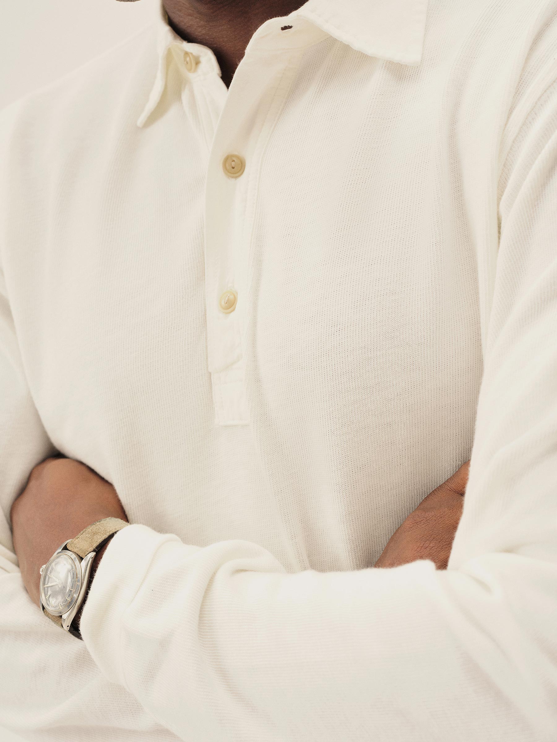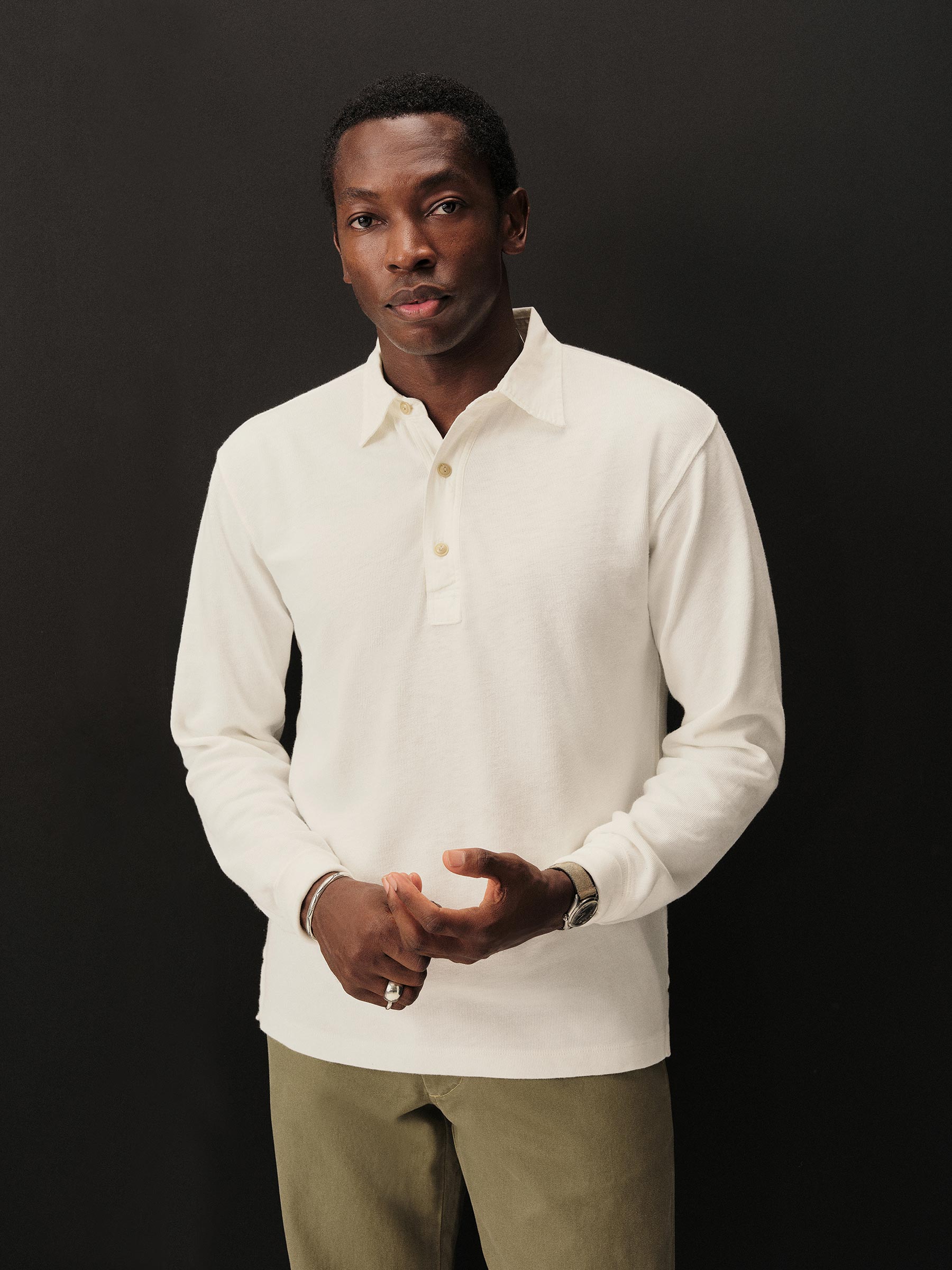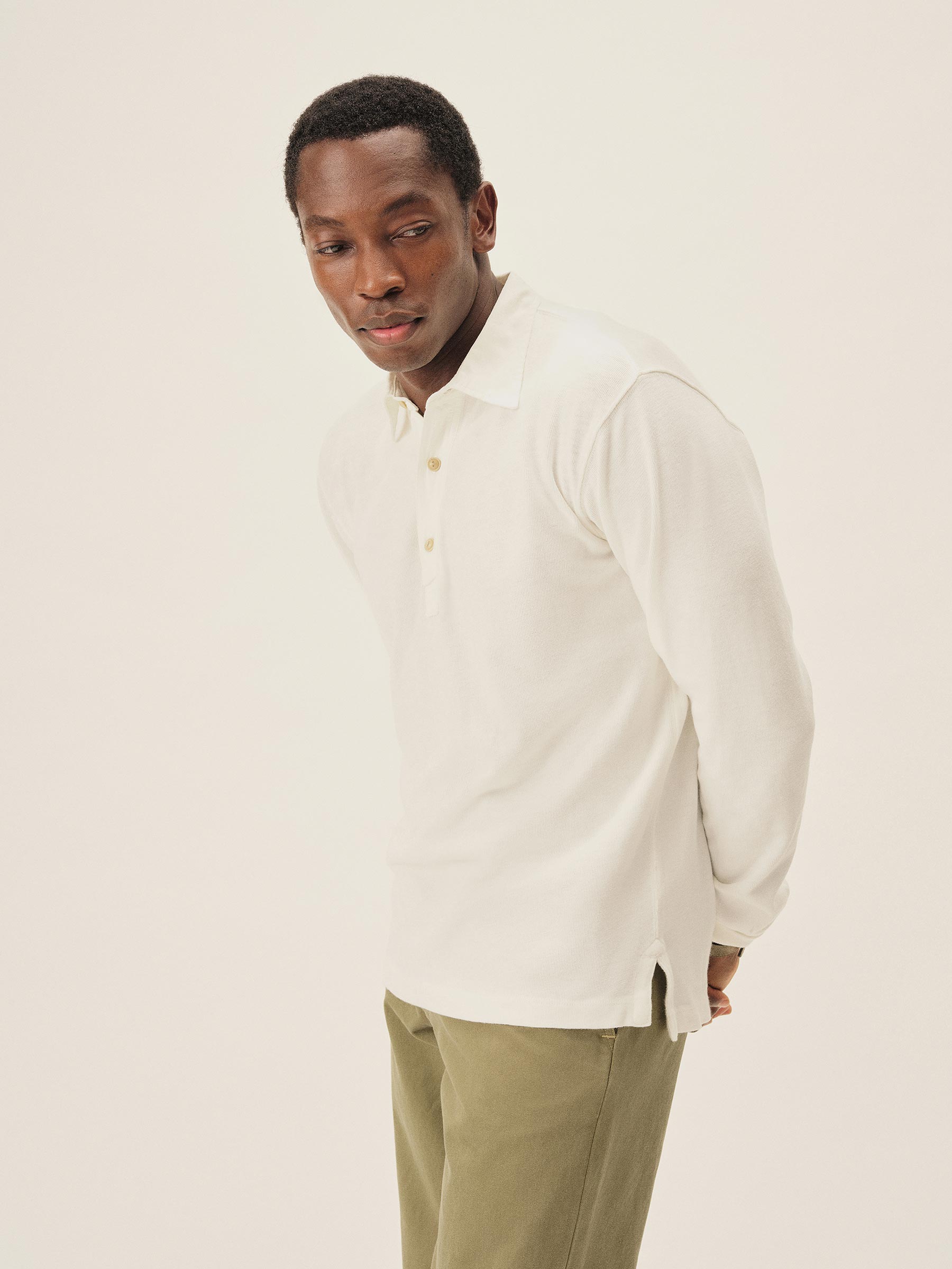 Classic fit long sleeve polo cut from yarn-dyed 310 GSM cotton jersey with the weight and durability of vintage rugby cloth. Details include a stepped hem with side seam vents, a three-button placket with shell buttons, and ribbing at the cuffs. Garment washed for a lived-in feel.