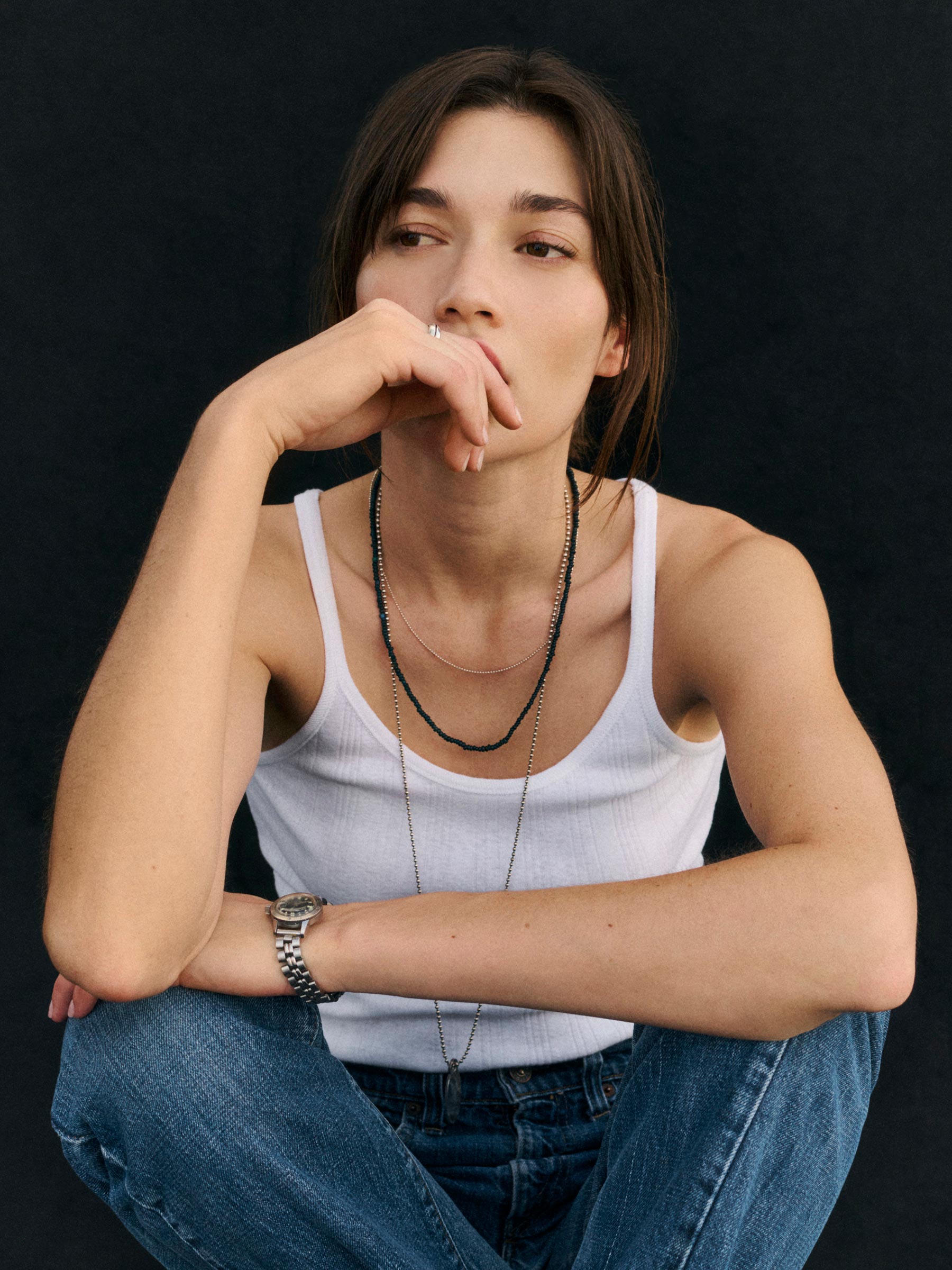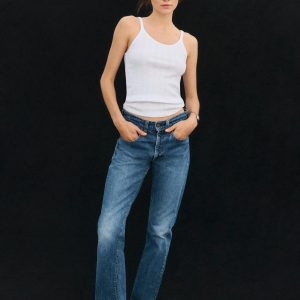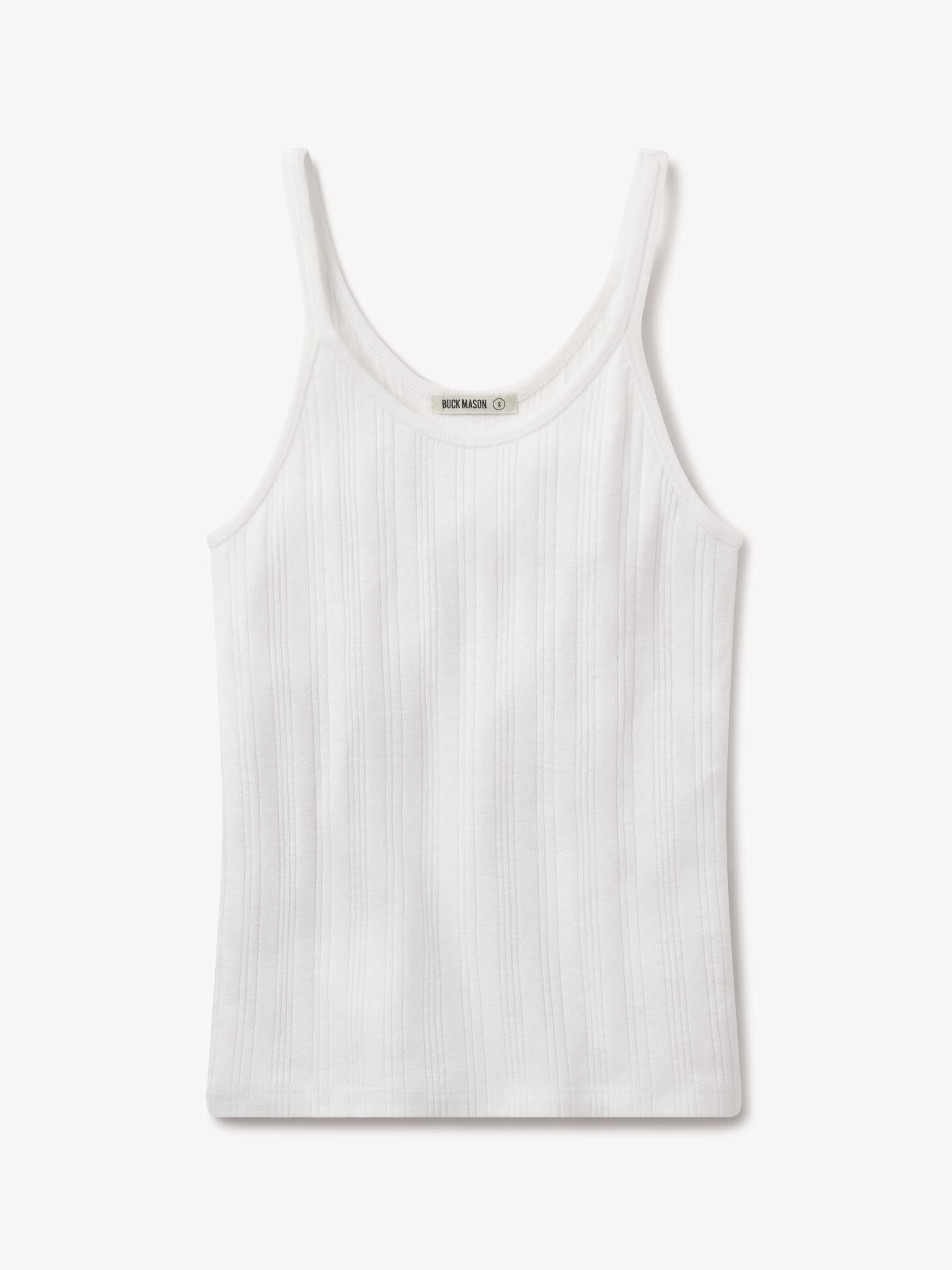 Slim-fit, vintage-inspired base tank made from a textured blend of 60% recycled cotton and 40% cotton. Features a scalloped scoop neckline, contrast rib binding, and discreet baby snaps at the shoulders to keep bra straps in place.