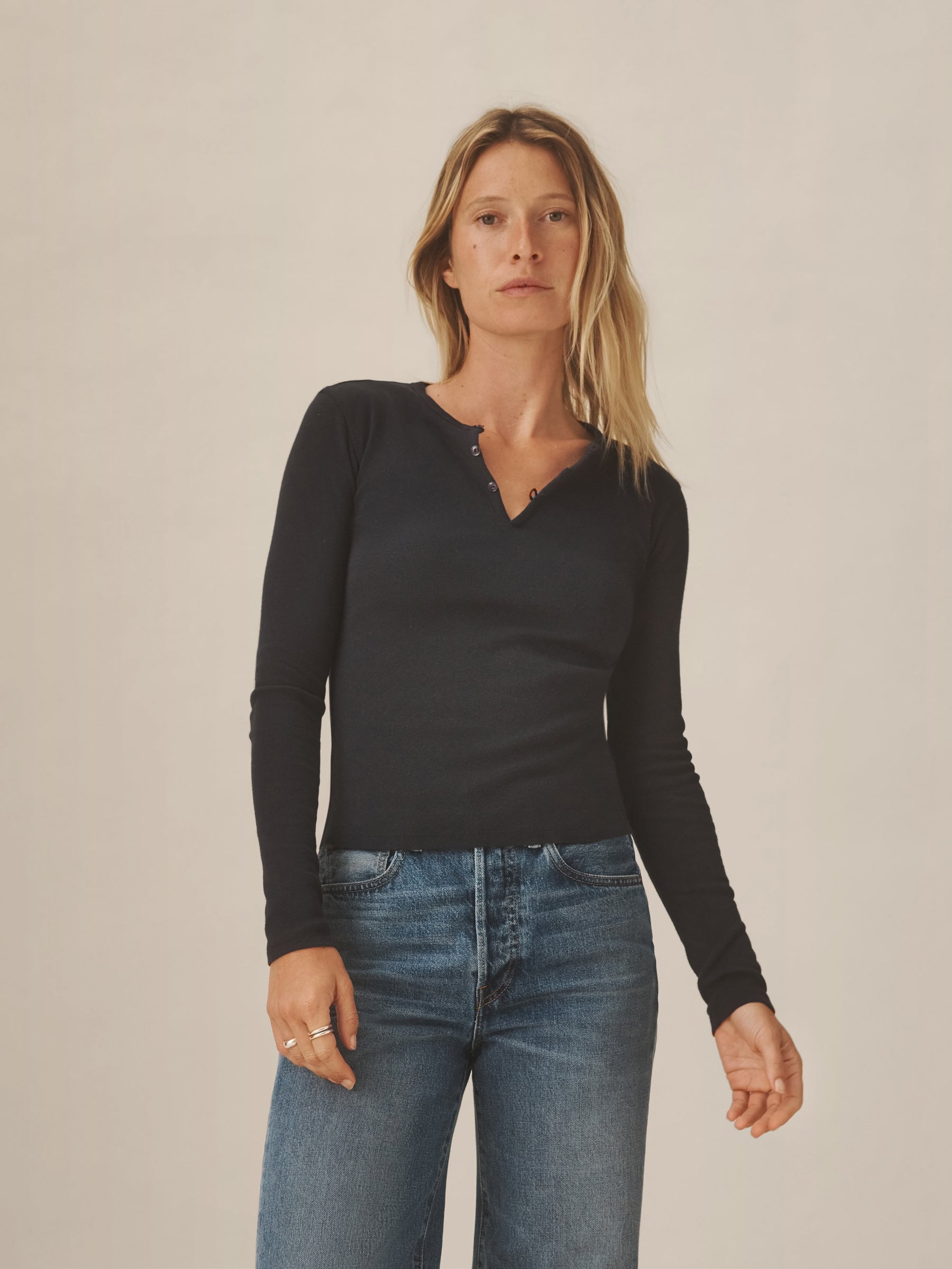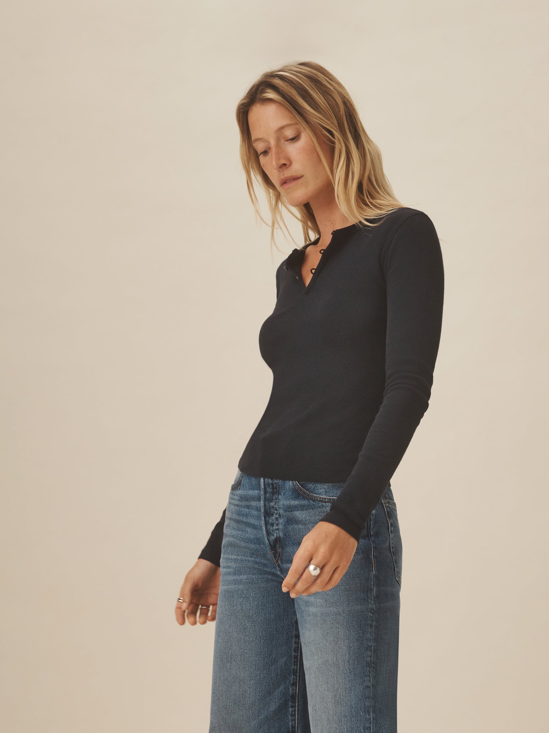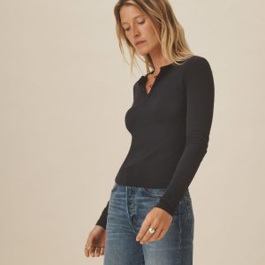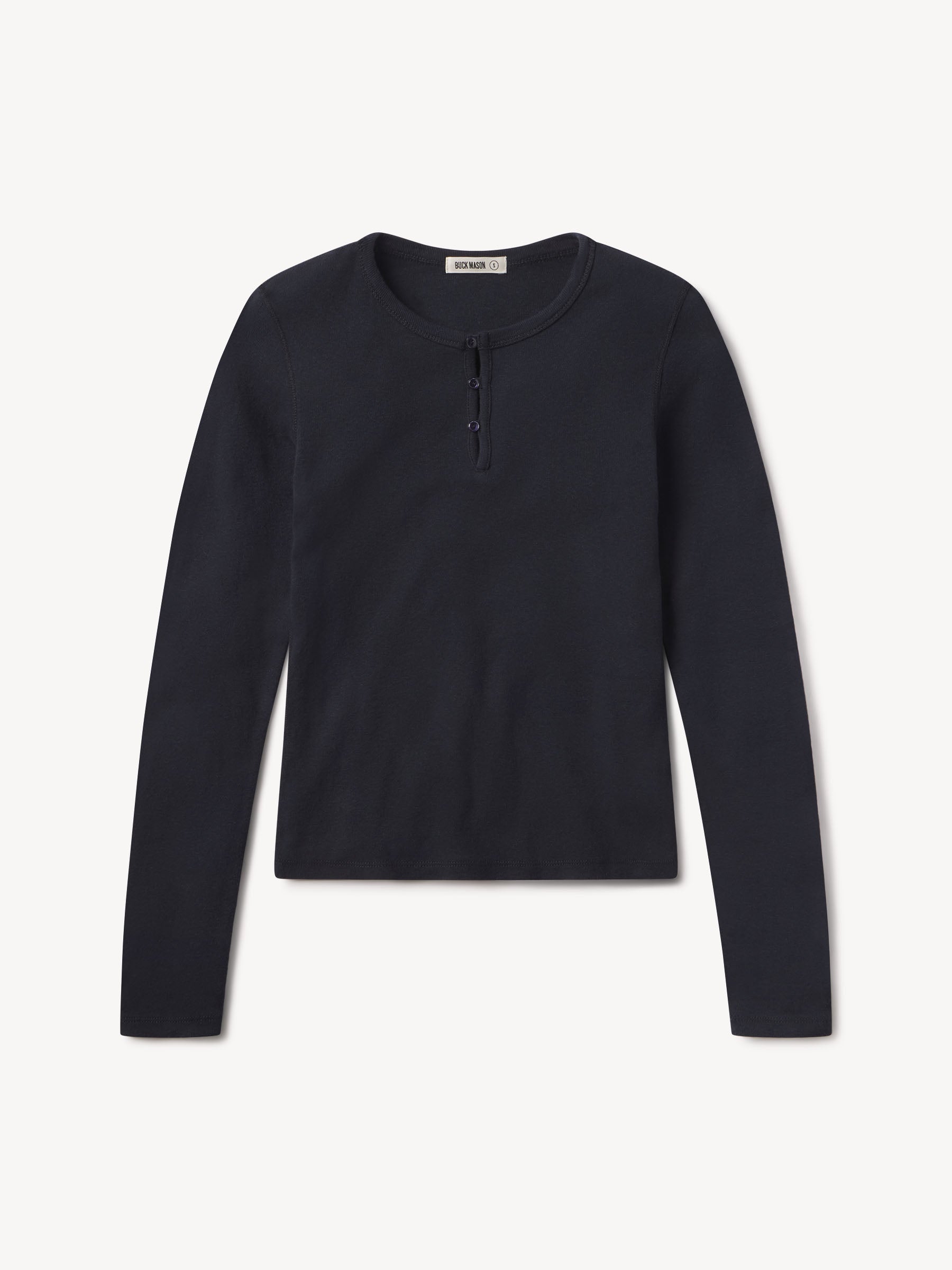 “Slim fit long sleeve henley cut from extra fine 170 GSM cotton with recycled content that holds its shape. Details include a a three-button loop placket with corozo fish eye buttons, and straight, clean finished hem and cuffs. Garment washed for a lived-in feel.