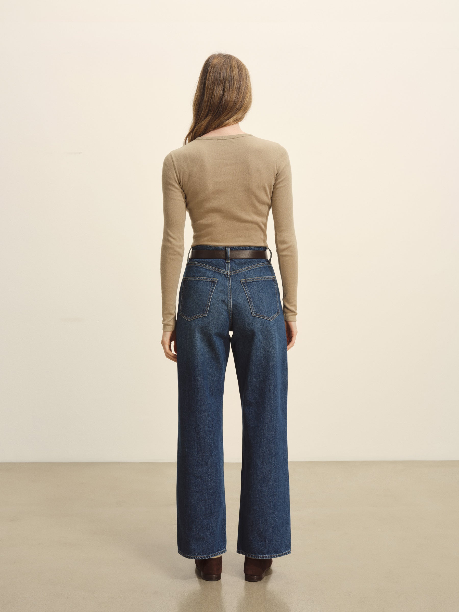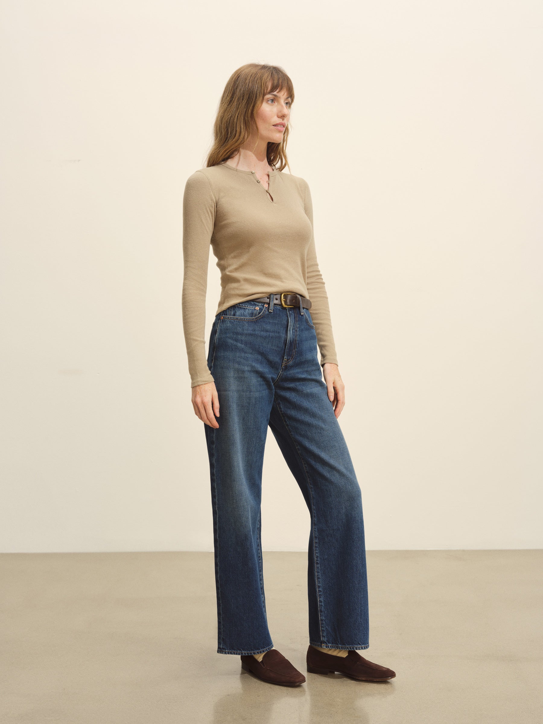 “Slim fit long sleeve henley cut from extra fine 170 GSM cotton with recycled content that holds its shape. Details include a a three-button loop placket with corozo fish eye buttons, and straight, clean finished hem and cuffs. Garment washed for a lived-in feel.