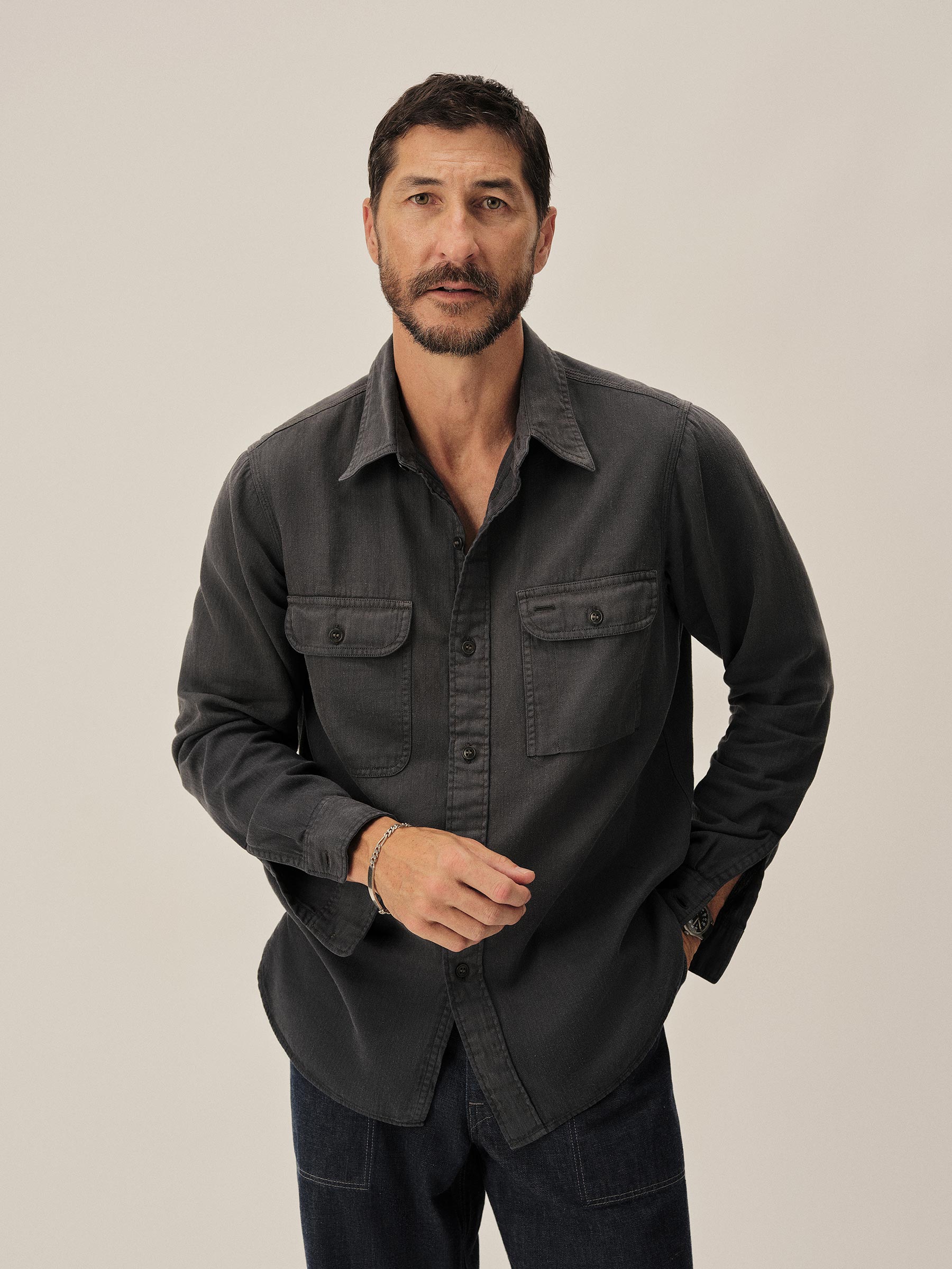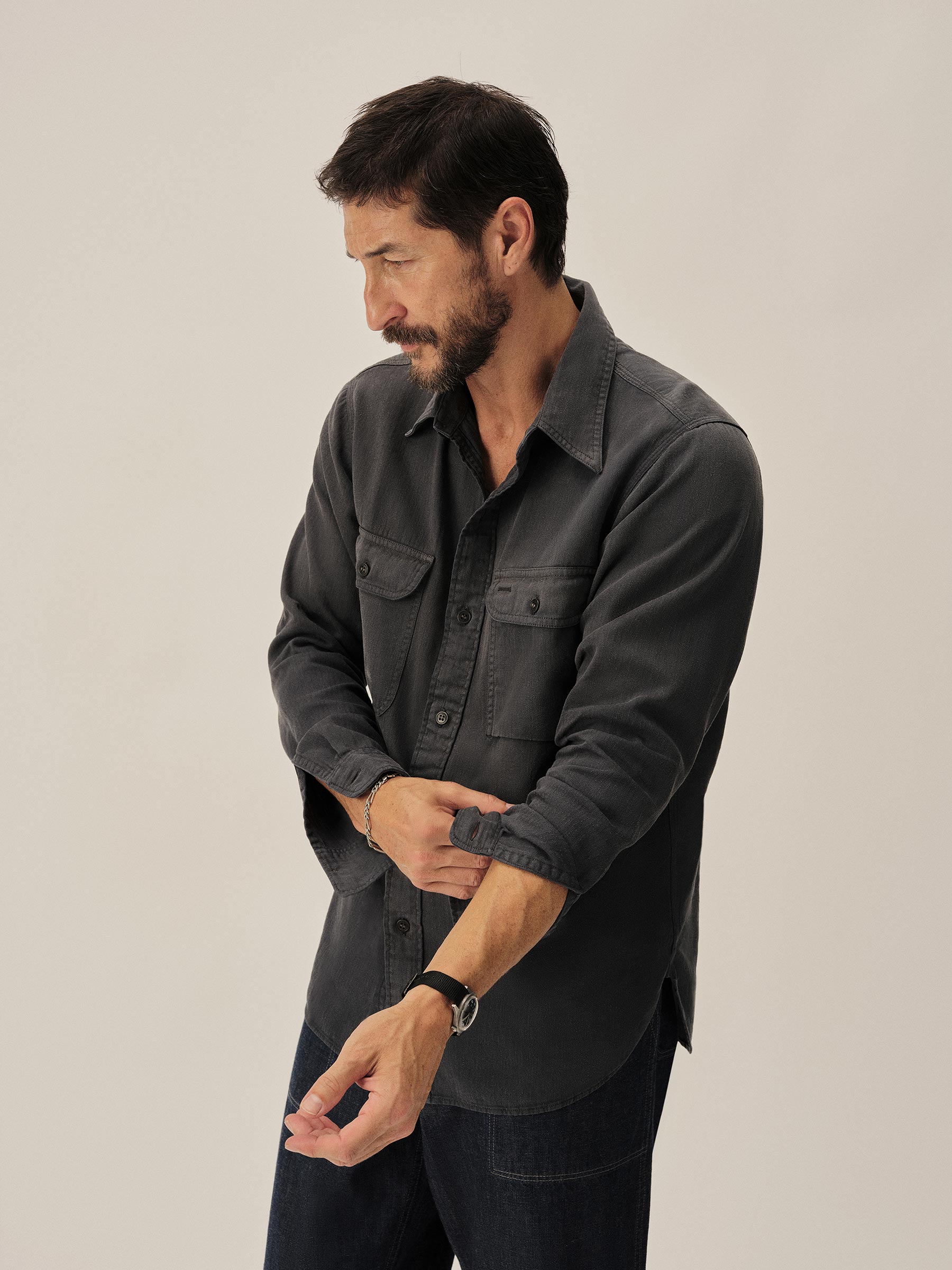 Born from the hardworking spirit of 1940s work shirts, the Soft Pack features a “cigarette pocket” at the chest and a narrow under-placket. Cut from a midweight, garment-dyed cotton/hemp HBT, and finished with a sun-fade effect, this shirt carries the weight of time.