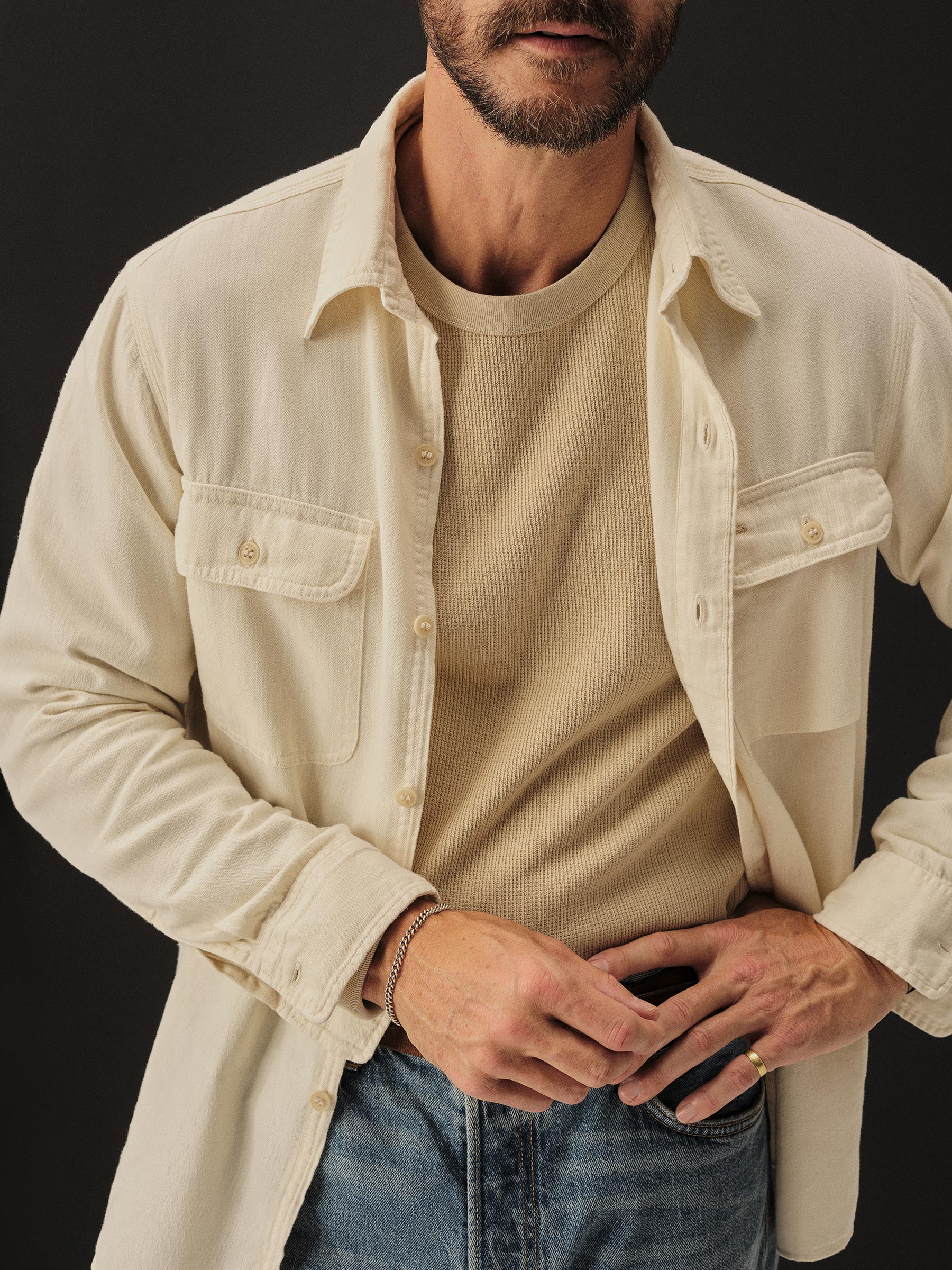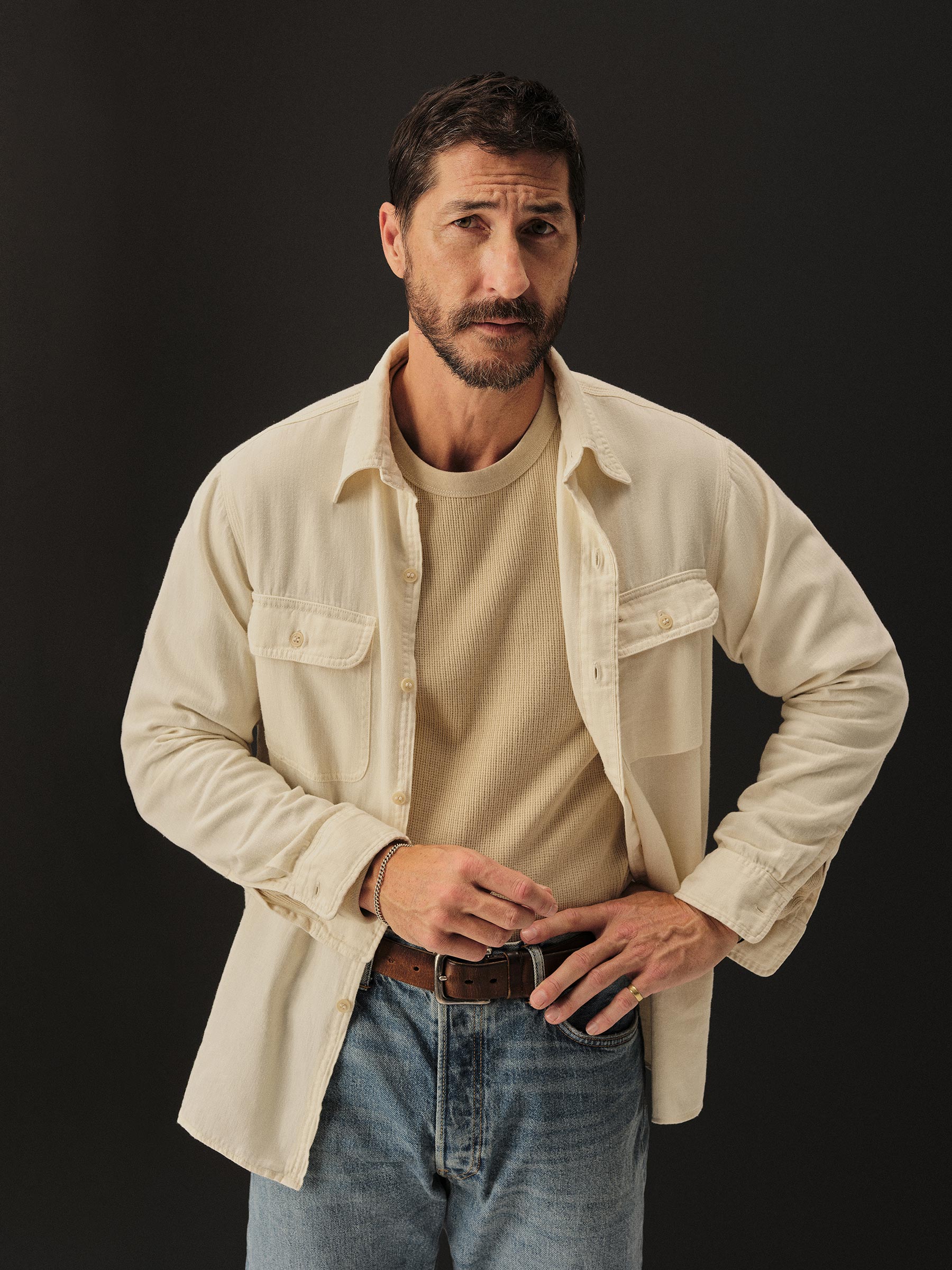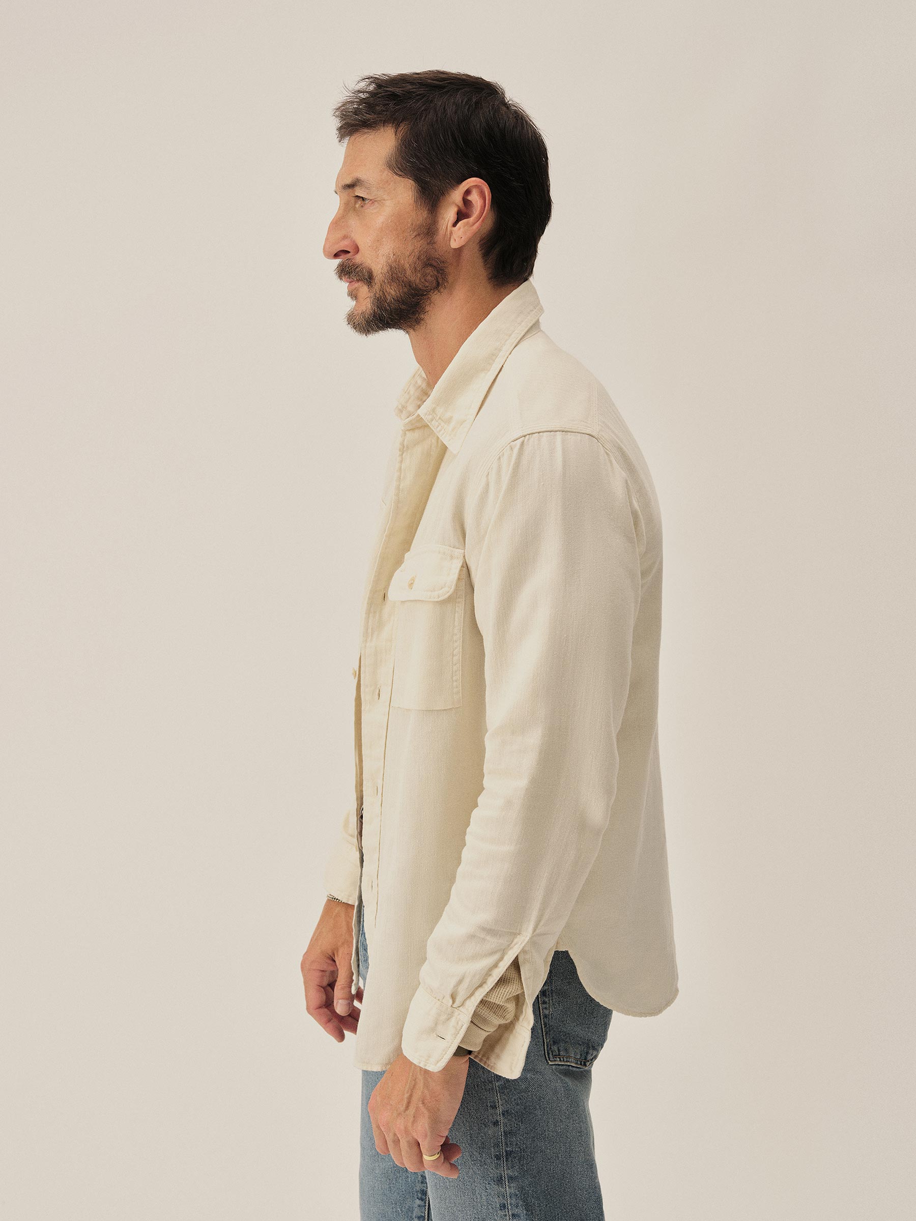 Born from the hardworking spirit of 1940s work shirts, the Soft Pack features a “cigarette pocket” at the chest and a narrow under-placket. Cut from a midweight, garment-dyed cotton/hemp HBT, and finished with a sun-fade effect, this shirt carries the weight of time.
