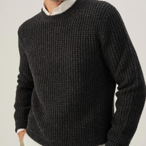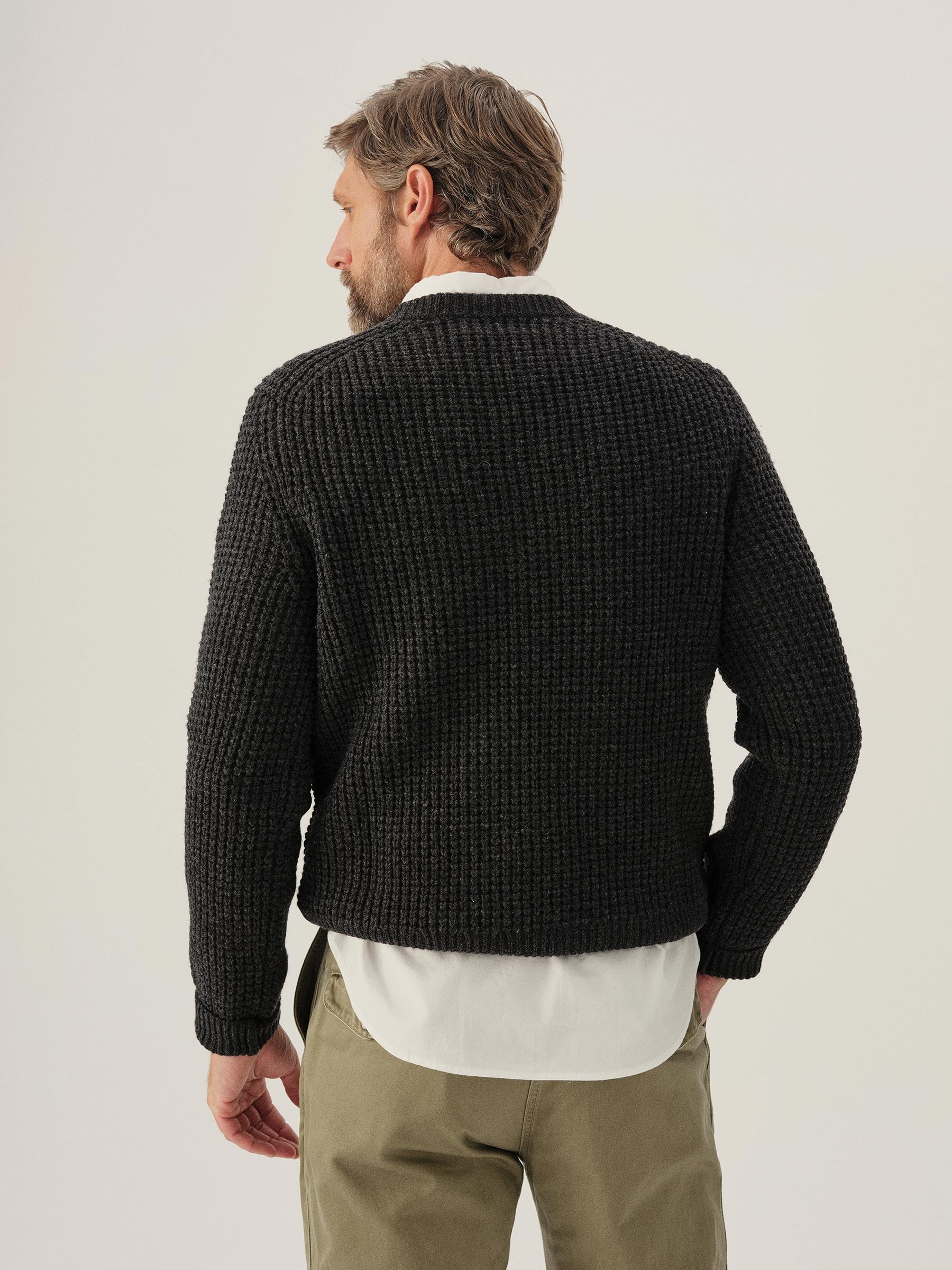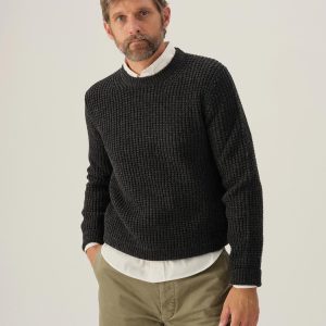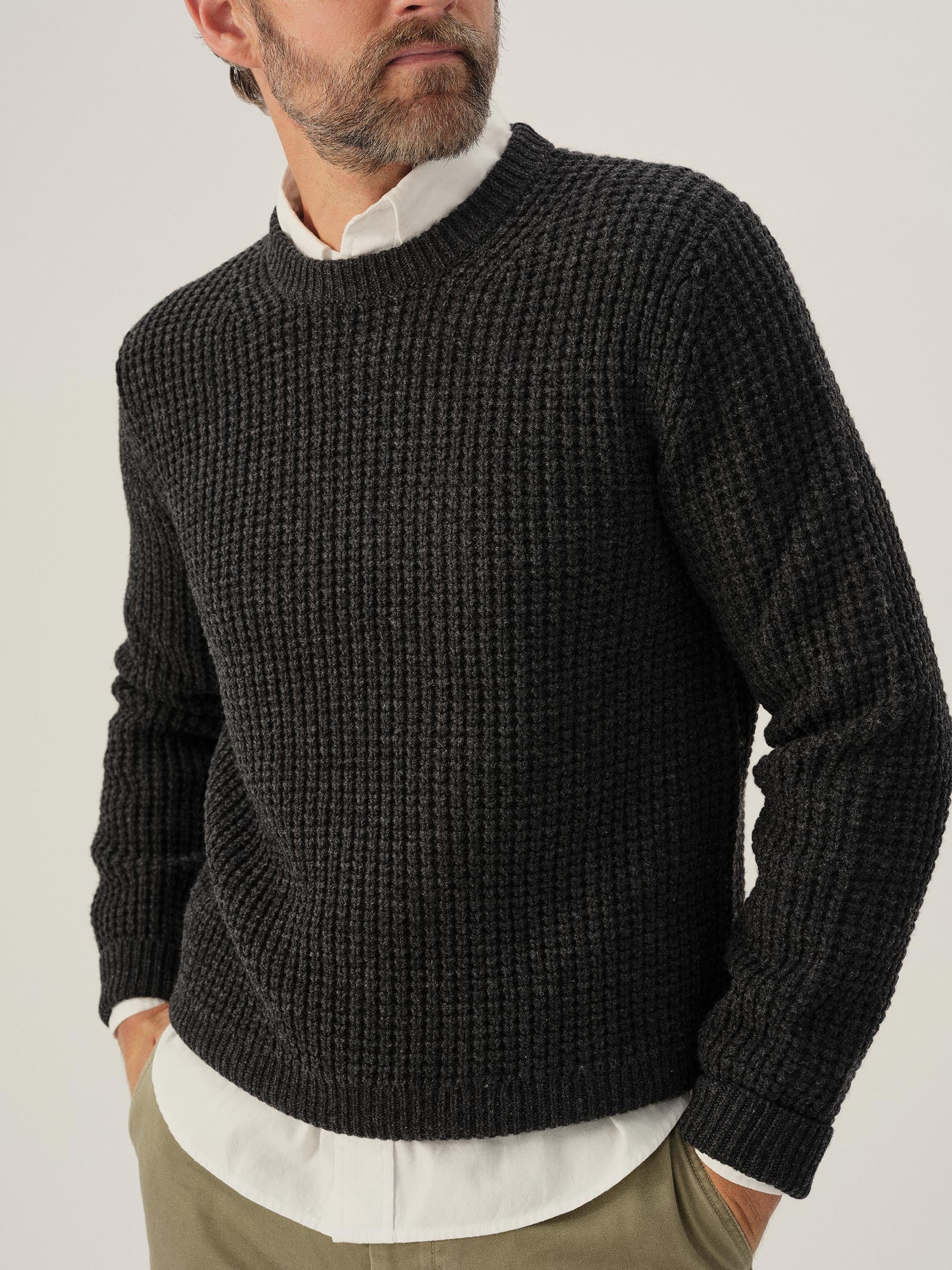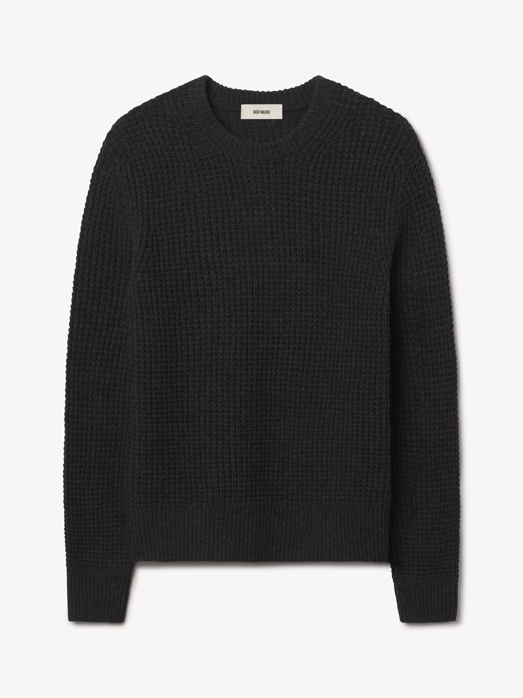 Classic crewneck waffle-knit from 5 gauge wool: a chunky, substantial yarn that’s soft to the touch. 95% Merino wool for warmth and durability, rounded out with 5% cashmere for added smoothness. The result: all the warmth, zero itch. Saddle shoulder for a comfortable fit with rib fashioning on the collar, cuffs, and hems.