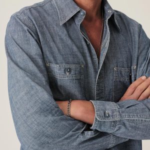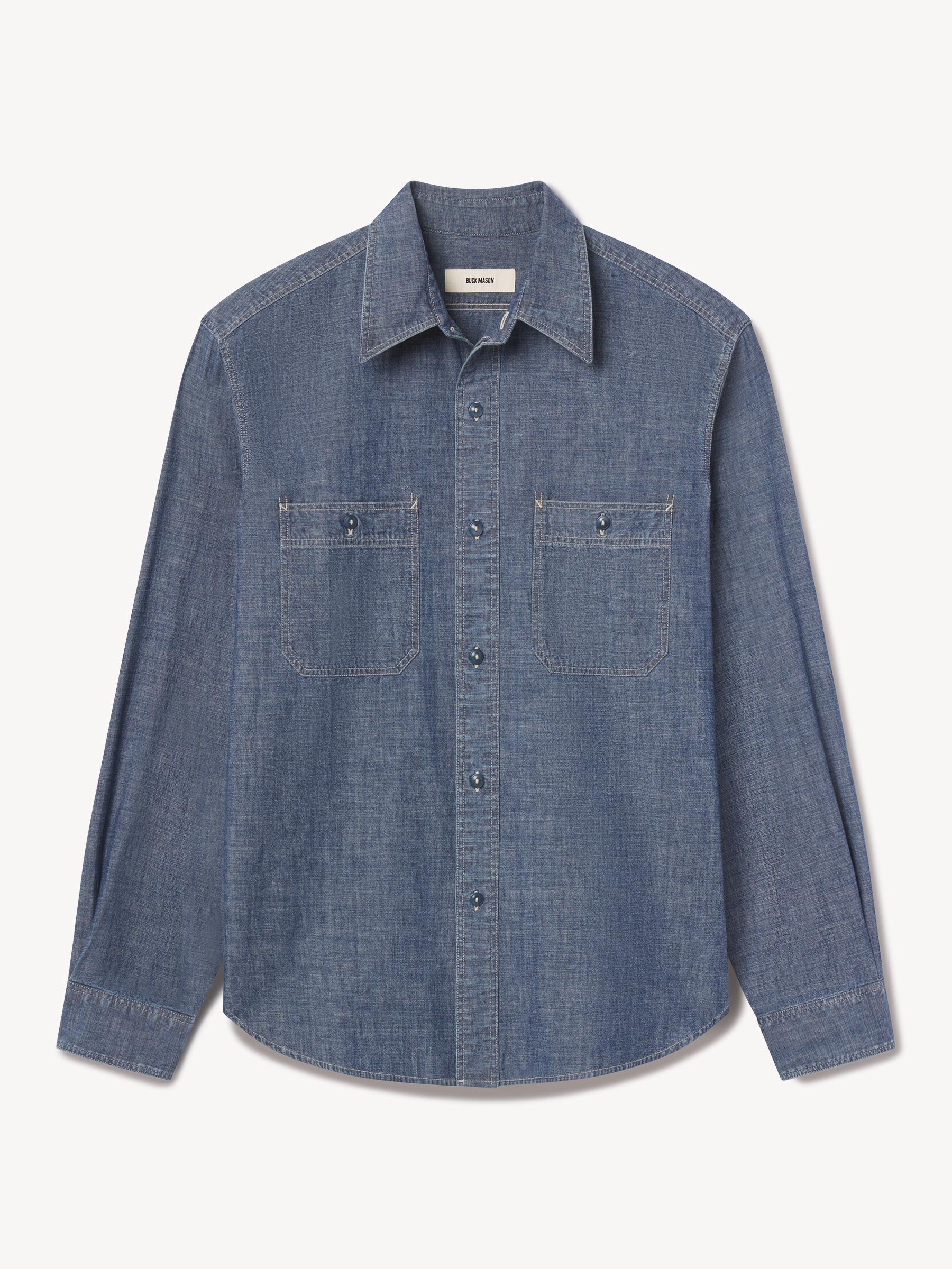 Classic fit work shirt cut from 5 oz indigo yarn-dyed chambray. Details include tonal buttons, two chest pockets, and run off stitching at the side gussets. Constructed with clean finished seams. Garment washed for a lived-in look and feel.