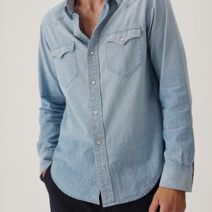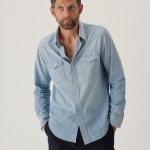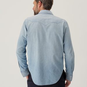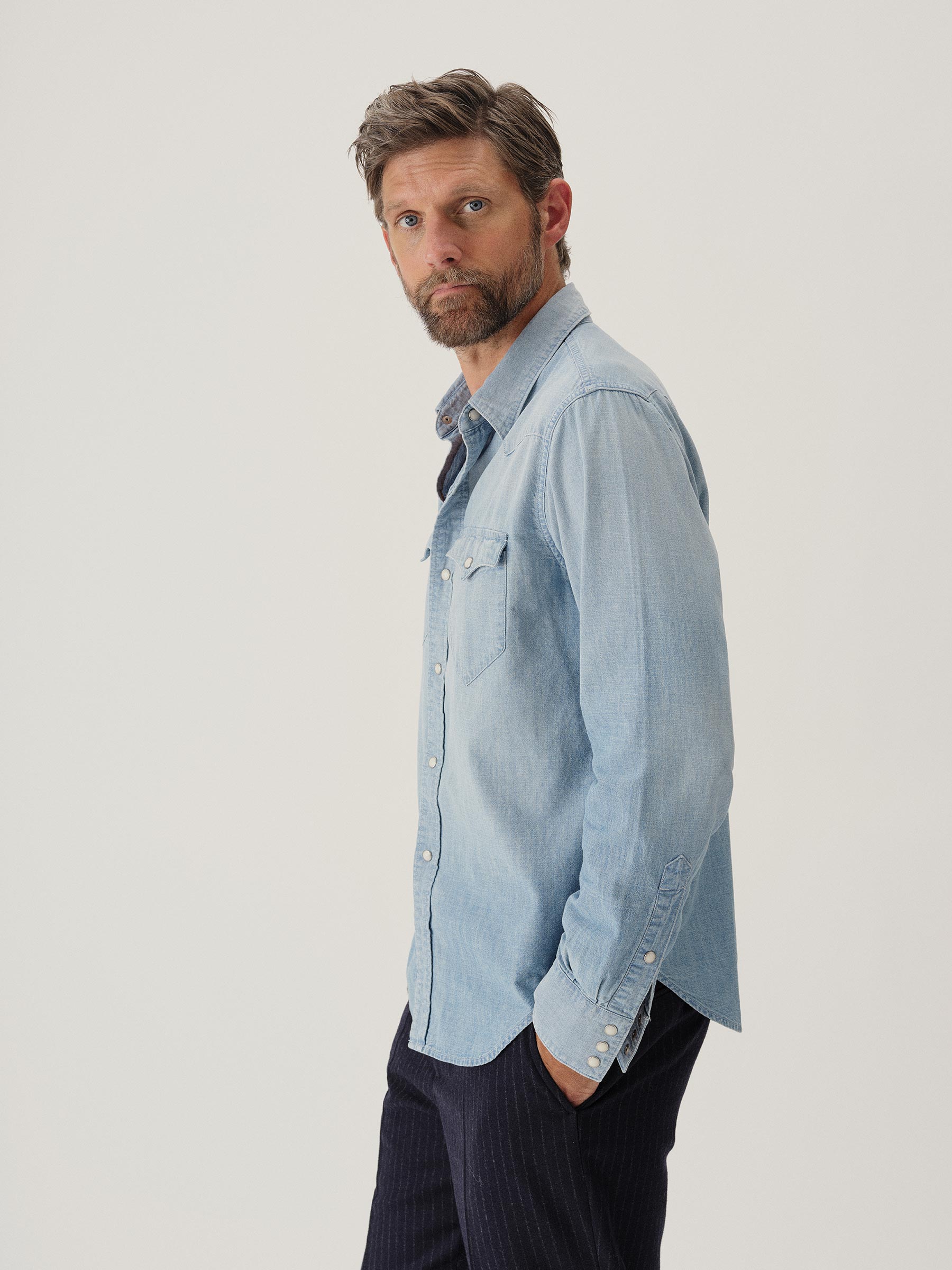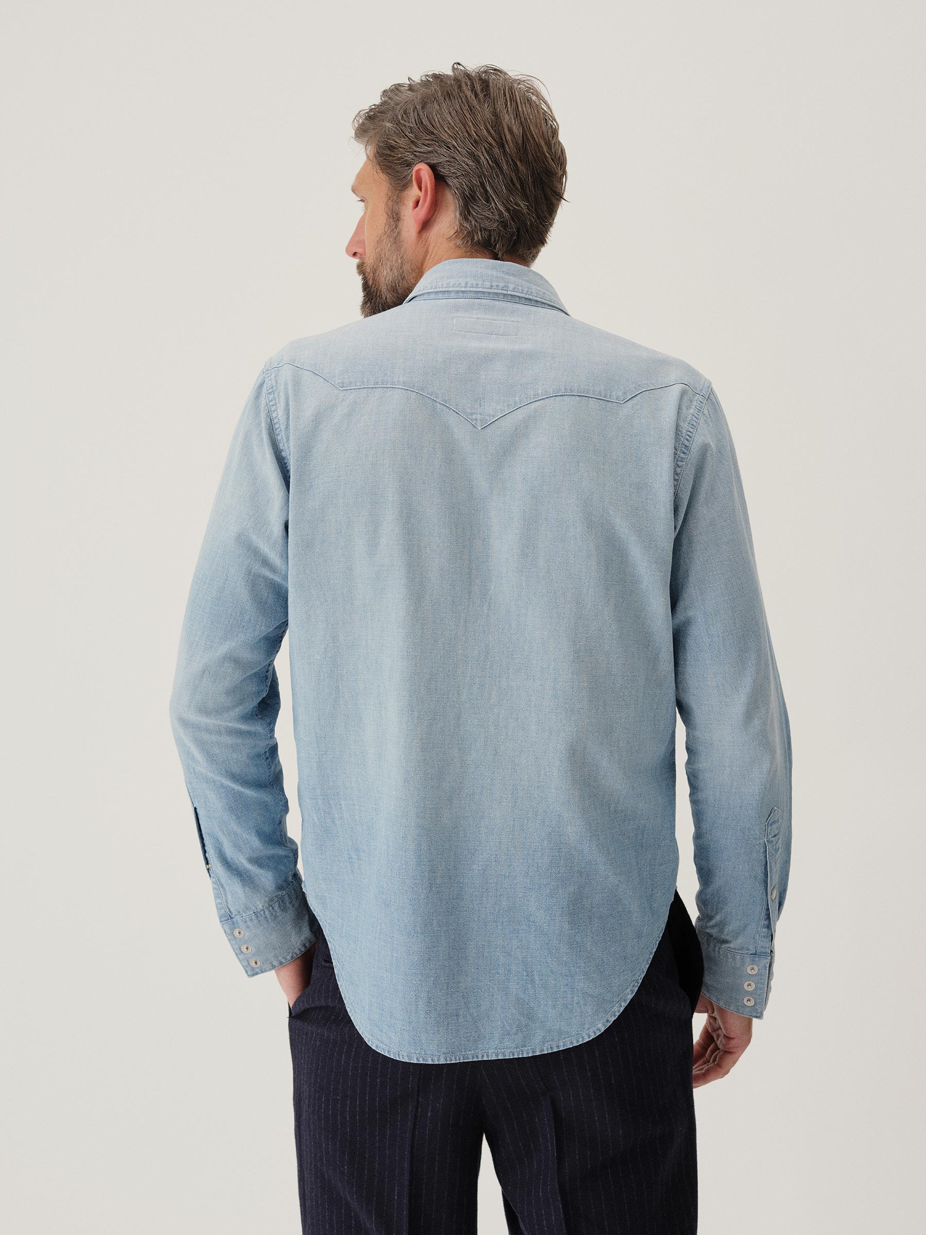 A classic western-style workshirt in a washed cotton chambray. The shirt has all cowboy details like pearl snap closures, curved western yoke, scalloped flap pockets, and three snaps along the cuffs. The blue chambray cotton has been washed for a lived-in feel.