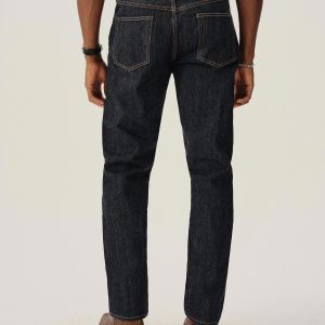 A classic 5-pocket jean in our Cowboy fit: Slightly higher rise with a tailored fit through the thigh and leg. Inspired by blue jeans from the 1940s through the 1960s, this shuttle loomed 14 oz. selvedge denim is unsanforized, and has an organic texture that develops more character with every wear. Garment rinsed for a lived-in feel. Details include copper rivets and a metal tack button fly.