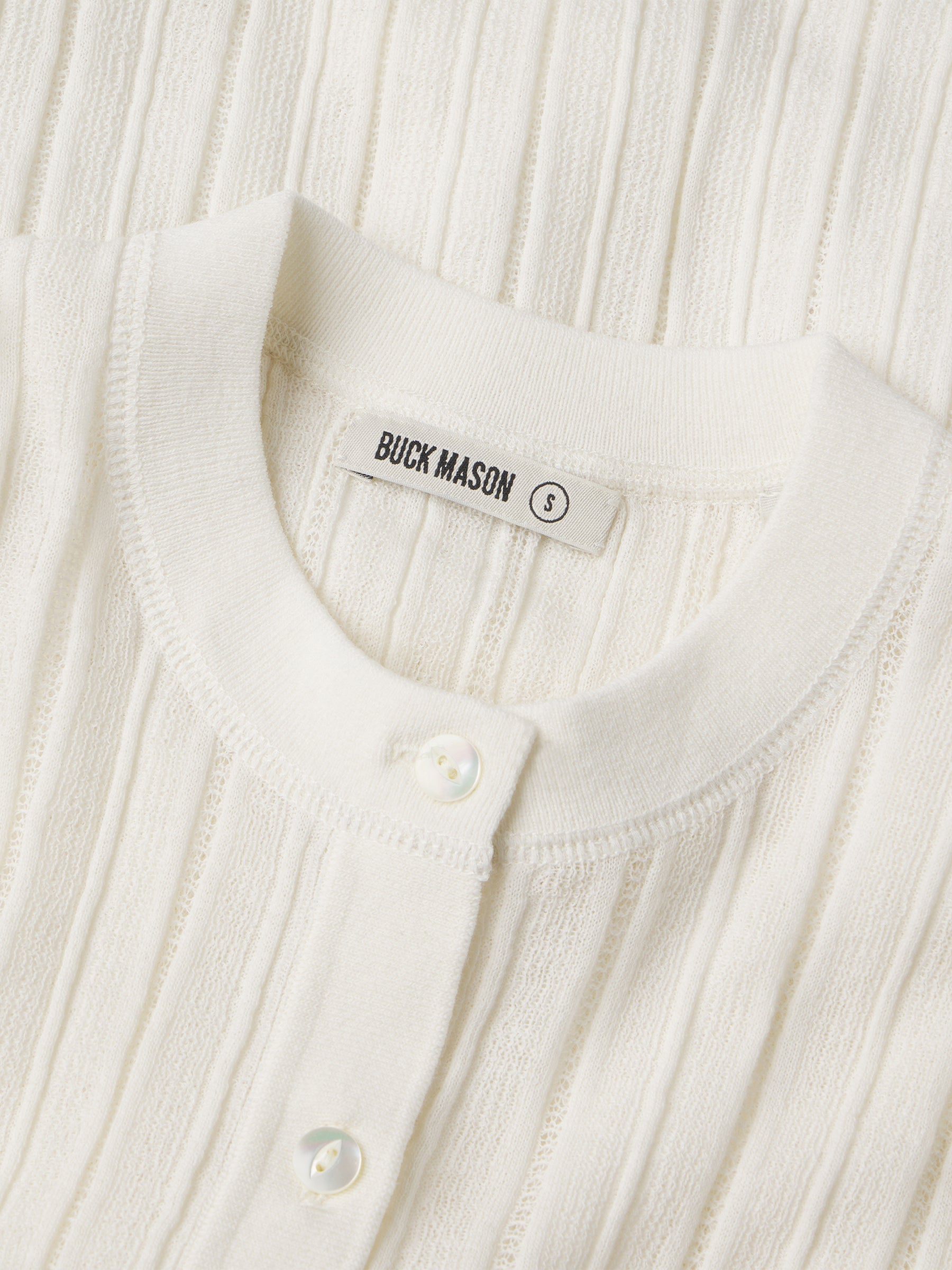 A slim henley crafted from a crepe wool-cotton blend yarn with natural texture and breathability. Designed with a flattering crew-meets-henley neckline, it’s constructed with a delicate pointelle drop-needle stitch throughout the body, functional mother-of-pearl shell buttons, and rib finishes at the cuffs and hem.