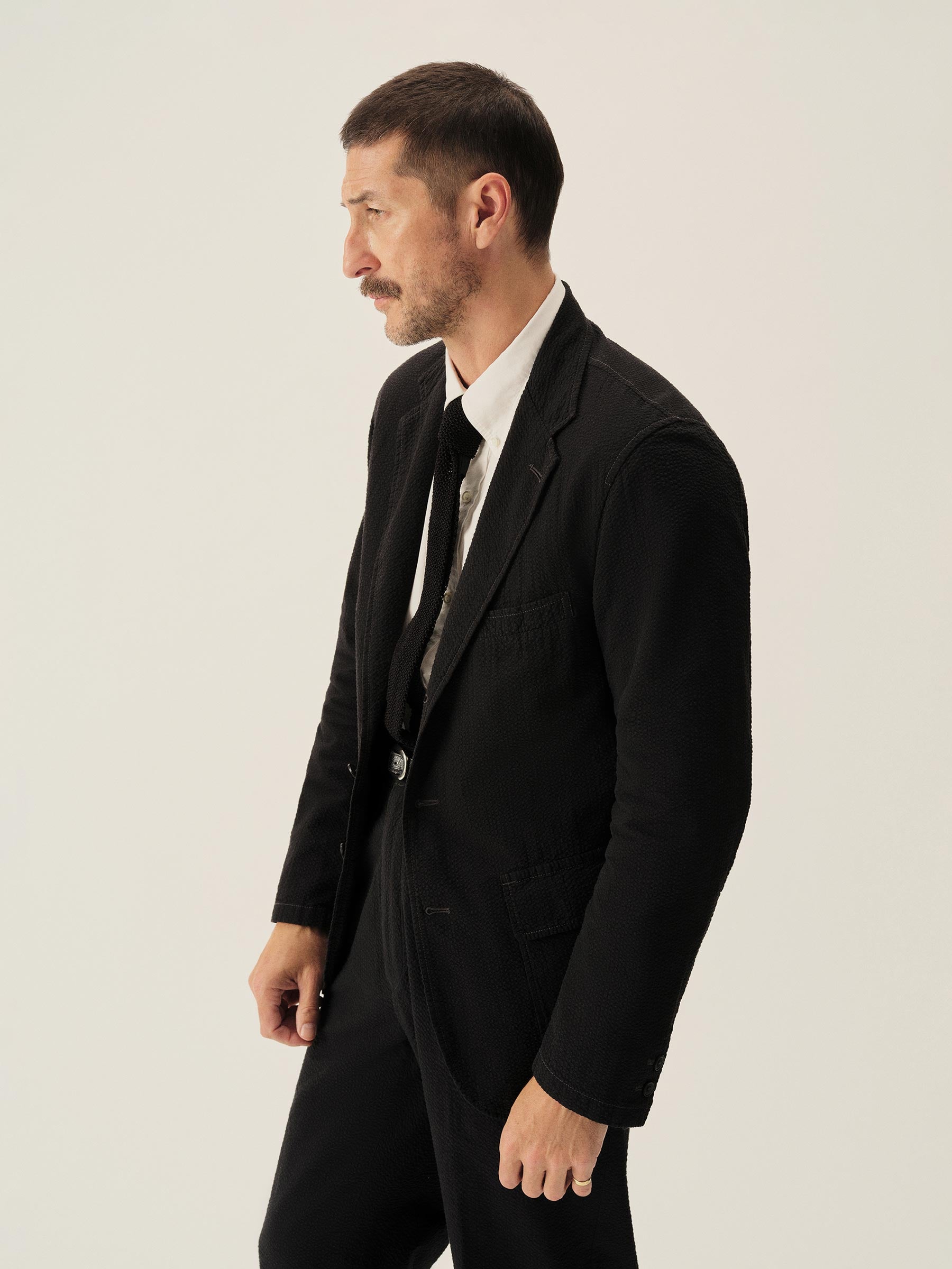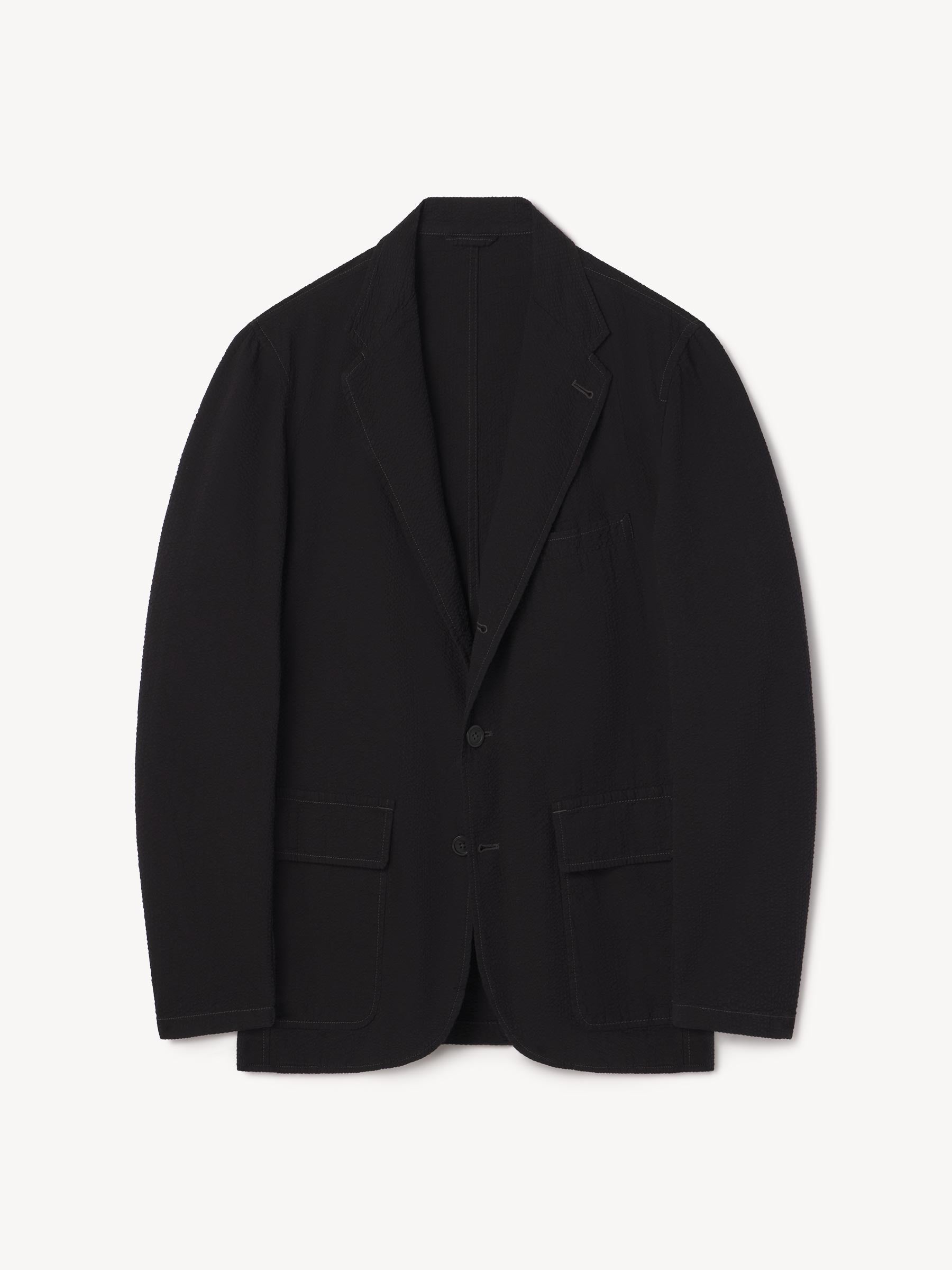 Tailored 3-roll-2 button blazer inspired by timeless vintage suiting. This 5 oz cotton seersucker has a rippled texture that wicks moisture and maintains airflow making it ideal for warmer climates. Details include two patch pockets, two internal welt pockets, and a notched lapel. We left it unlined and omitted the back vent and cuff buttons for a casual, streamlined look. Constructed with hand-linked seams and garment washed with enzymes and softener for a lived-in feel.