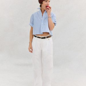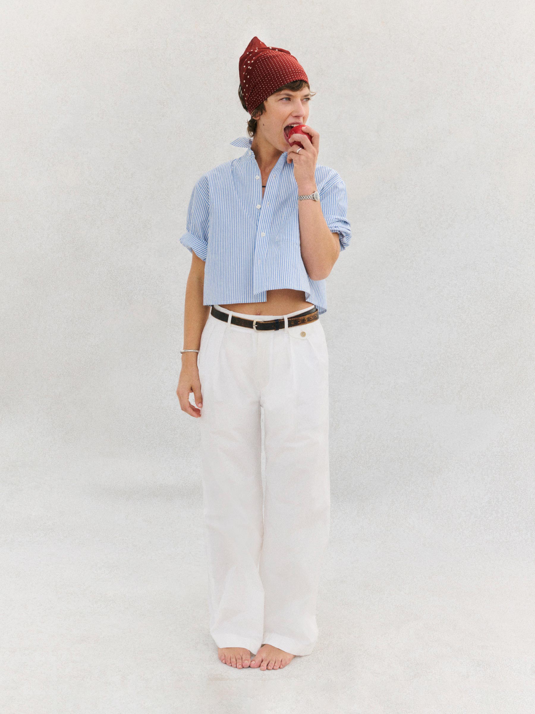 Our Mainstay button-down shirt, reimagined for summer with a 20 ¼” cropped body and rolled sleeves, cut from a lightweight, 2.8 oz. cotton weave. Featuring felled seams and a back yoke with a box pleat. Finished with mother of pearl buttons and garment washed for a broken-in feel.