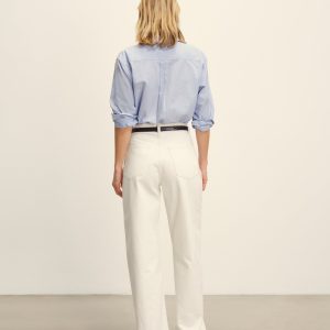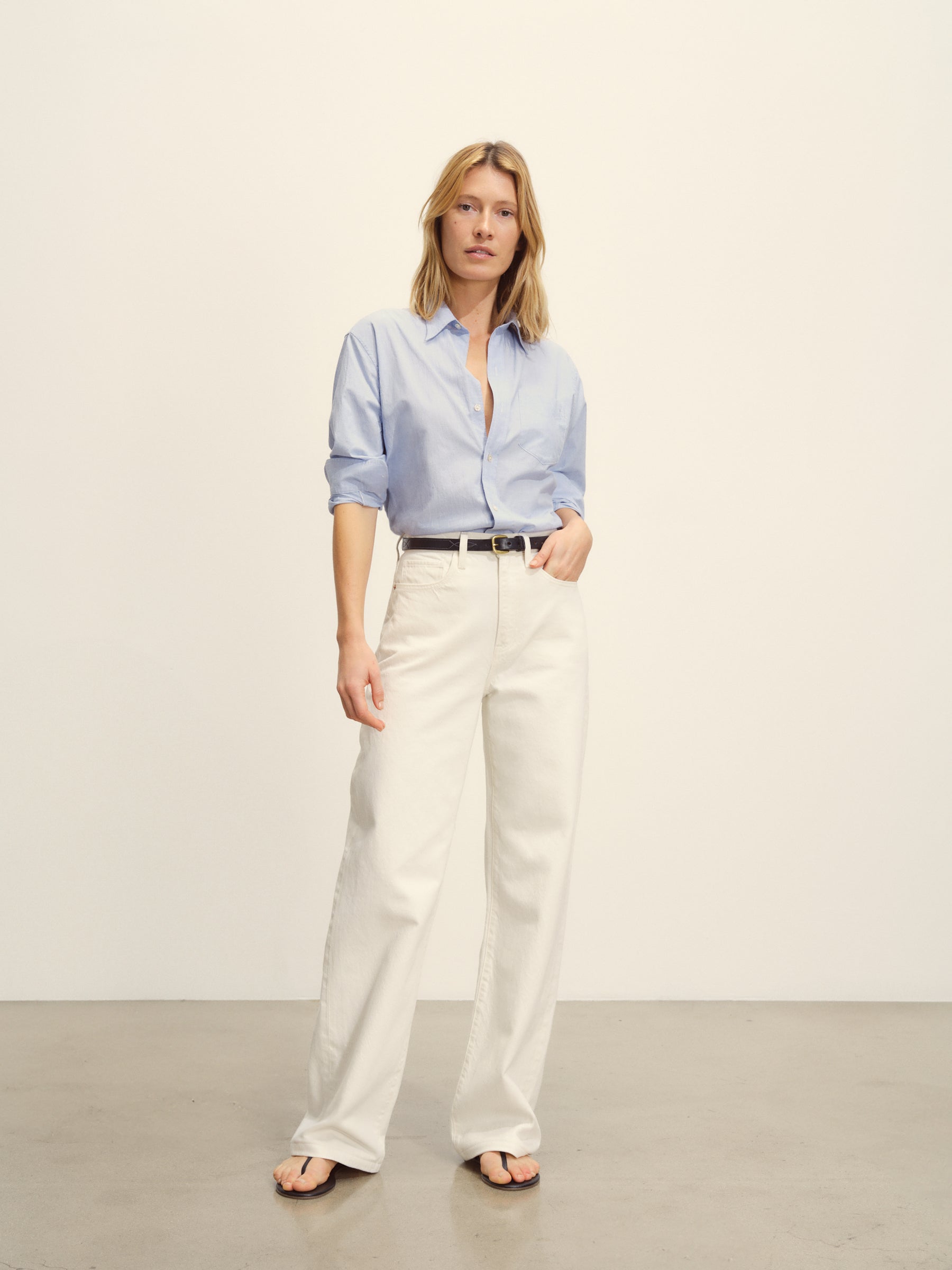 Relaxed button-down shirt in 3.7 oz. cotton plainweave. 29.5” length hits just below the hip. Details include a back yoke with box pleat, a single spade pocket, and pleated cuffs. Inspired by mid-century men’s shirting, this piece can be worn on its own, layered over a tee, or paired with our Rider Pant. Garment washed with softener for a lived-in feel.
