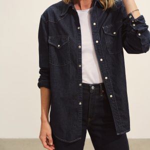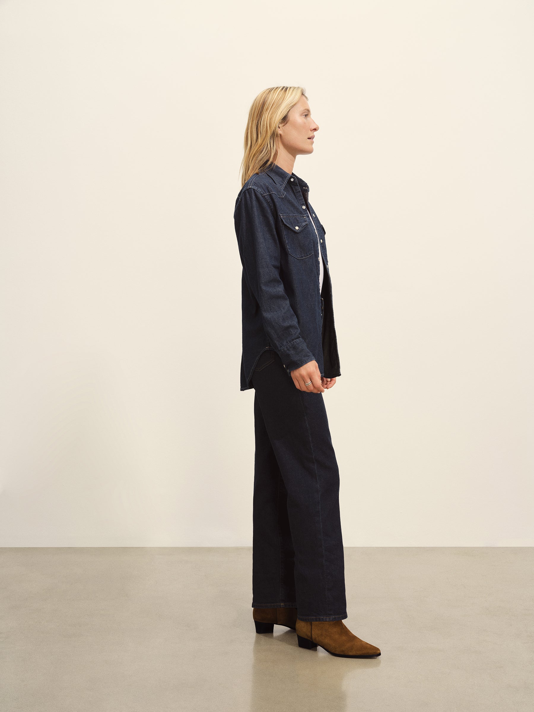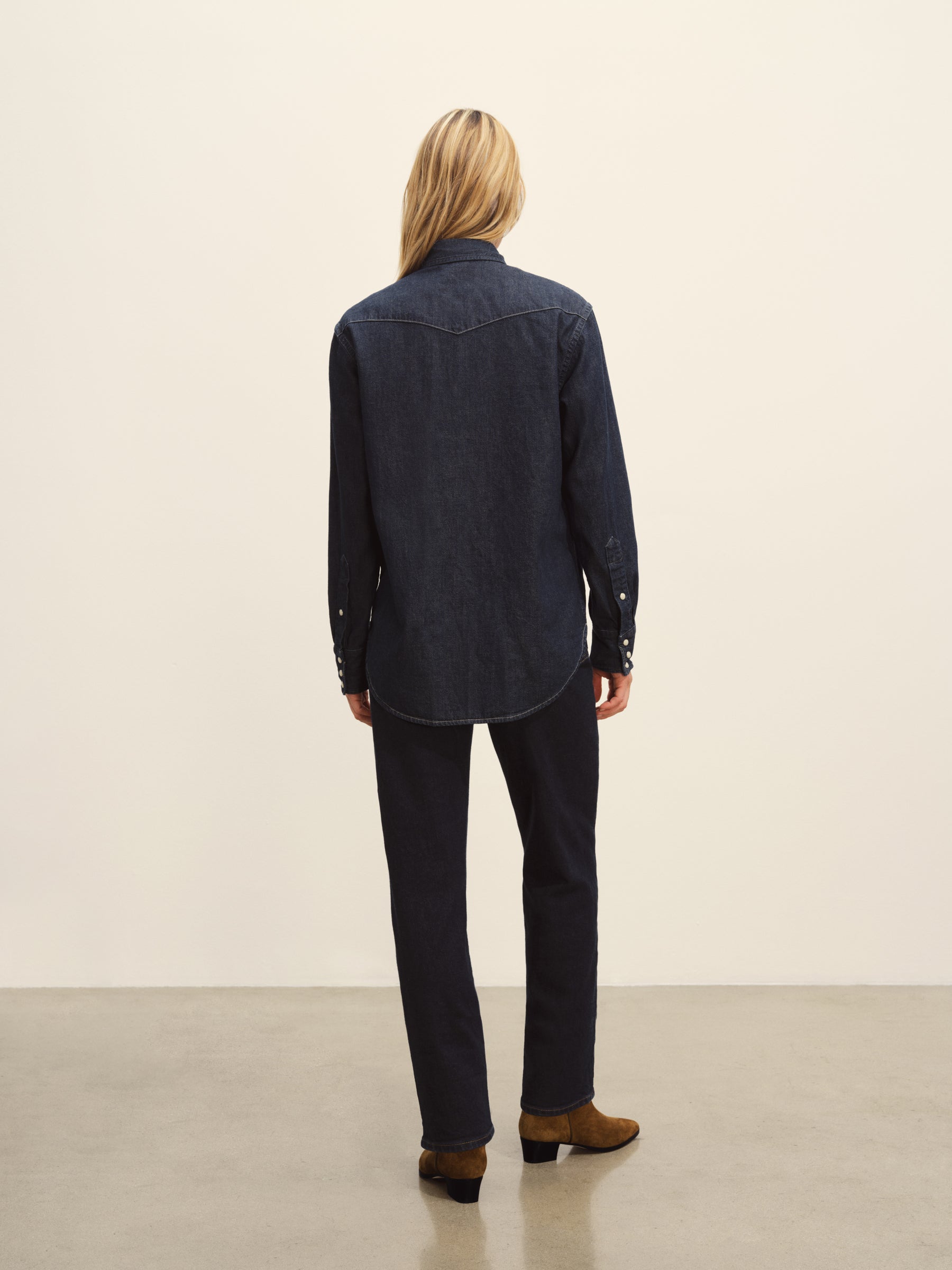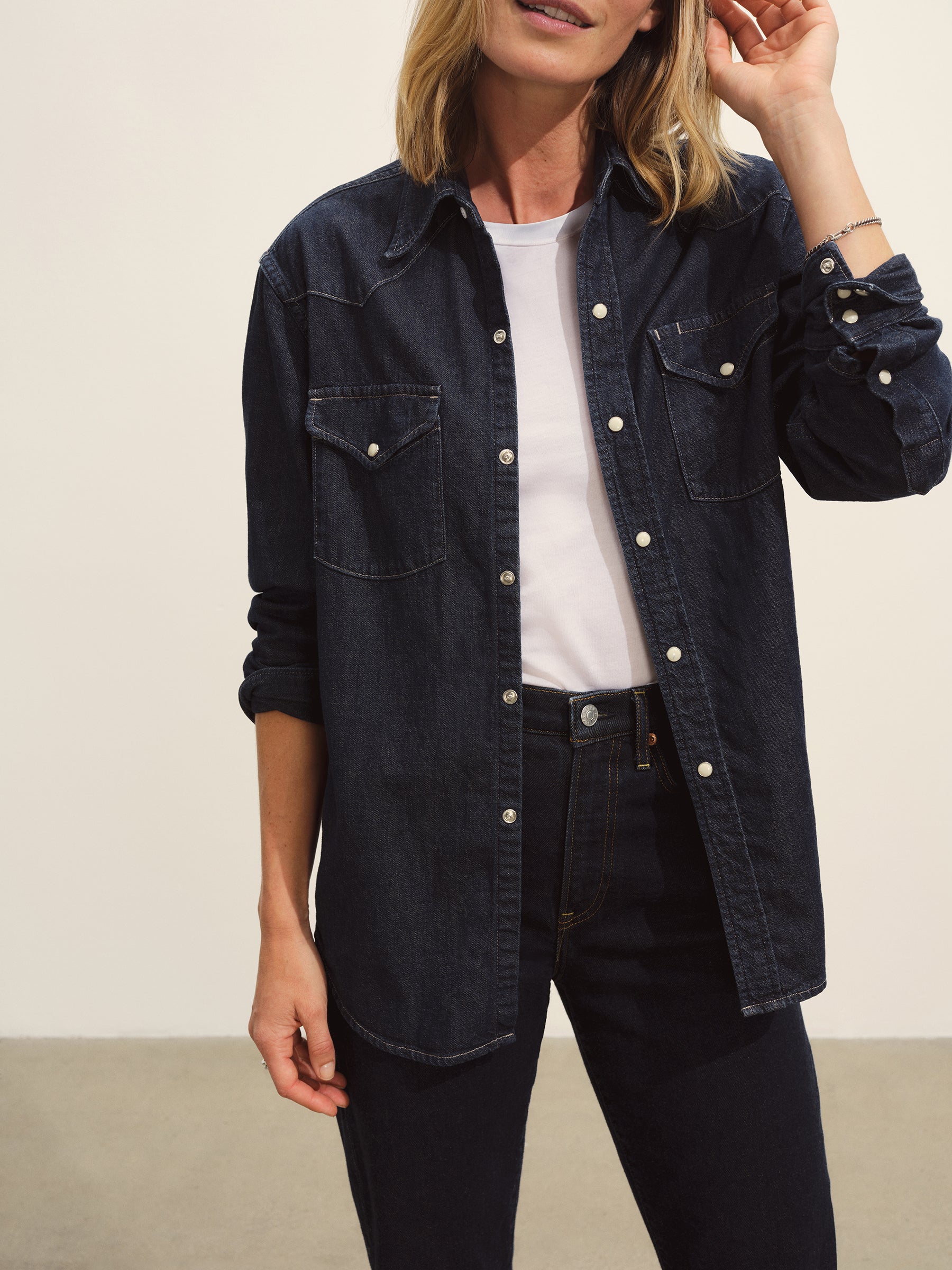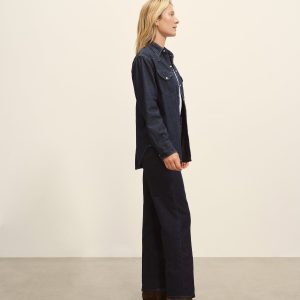 Inspired by vintage western shirting, our take has utility-style details like an angled front yoke, a back yoke, flap pockets, cuffs, and contrast stitching. Made from light and drapey 8 oz denim with an irregular raised nep texture, it’s finished with Japanese pearl snaps and garment washed for a lived-in feel.