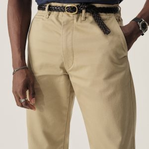 The classic officer’s pant in our Ford Standard fit: mid-rise, straight through the thighs with a taper below the knee. Cut from 9.5 oz cotton twill that has been washed to achieve the same look and feel of vintage service uniforms. Features a “Hollywood” one-piece waistband construction, slash front pockets, buttoned flap back pockets, and a welted coin pocket, natural canvas interior detailing, and real corozo buttons. Garment washed with enzymes for a lived-in feel. Zip fly.