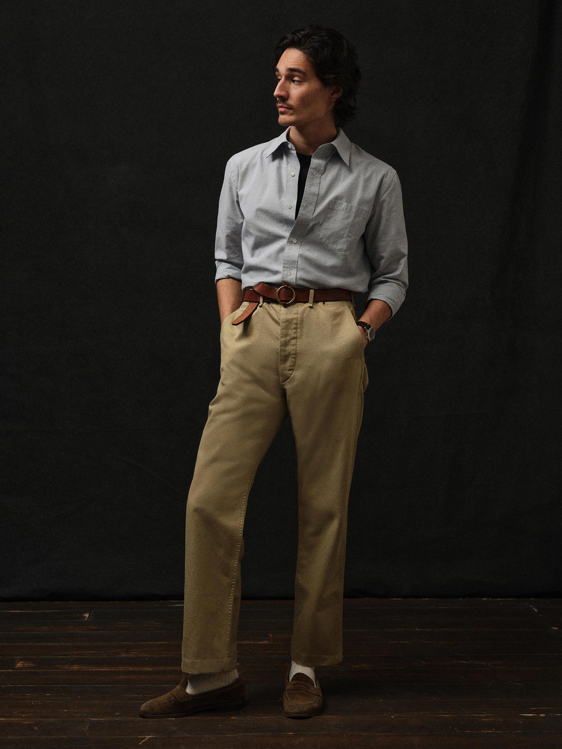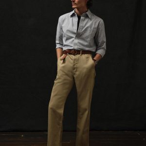 The classic officer’s pant in our Full Saddle fit: high-rise, straight through the thighs and leg. Cut from 9.5 oz cotton twill that has been washed to achieve the same look and feel of vintage service uniforms. Features a “Hollywood” one-piece waistband construction, slash front pockets, buttoned flap back pockets, and a welted coin pocket, natural canvas interior detailing, and real corozo buttons. Garment washed with enzymes for a lived-in feel. Button fly.