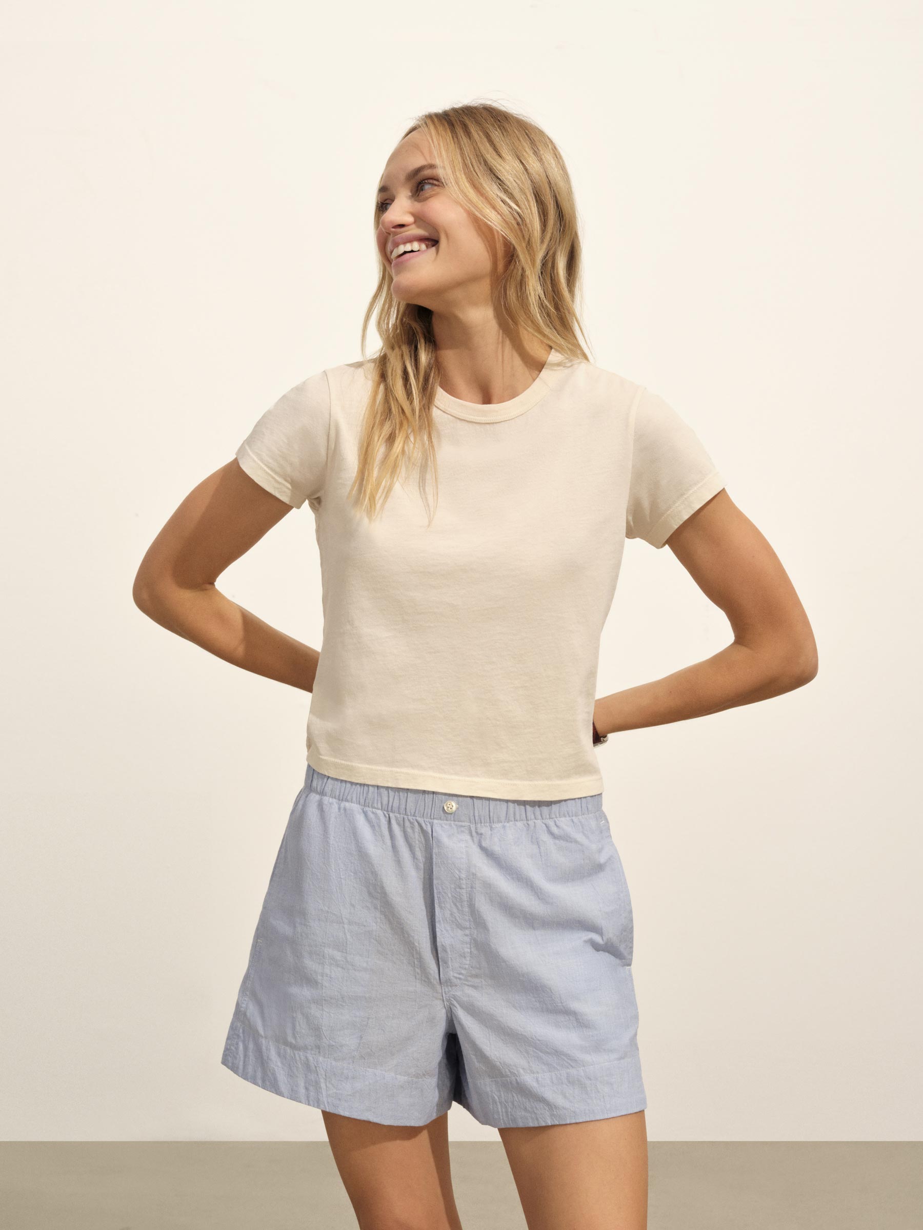 Boxy short sleeve crewneck tee with a straight hem. Cut from 120 GSM Supima cotton. Constructed with rib neck binding and double-needle cover-stitching at the hem. Garment washed for a lived-in feel.