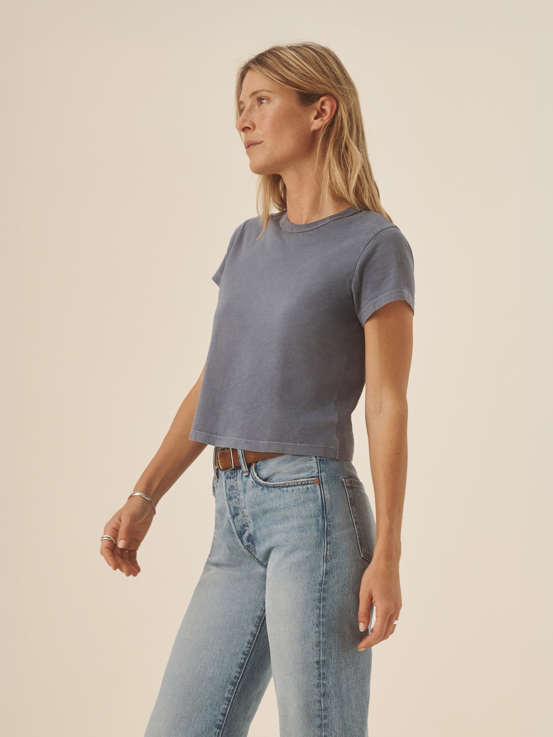 Boxy short sleeve crewneck tee with a straight hem. Cut from 120 GSM Supima cotton. Constructed with rib neck binding and double-needle cover-stitching at the hem. Garment washed for a lived-in feel.