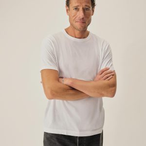 Classic fit short sleeve crewneck tee with our signature curved hem, cut from USA-grown and milled 140 GSM jersey knit from long-staple Supima cotton with a soft, smooth hand and sewn at BM Knitting Mills in Mohnton, PA. Constructed with self-neck binding and a flat stitch finish for comfort. Garment washed with enzymes and softener for a lived-in feel.