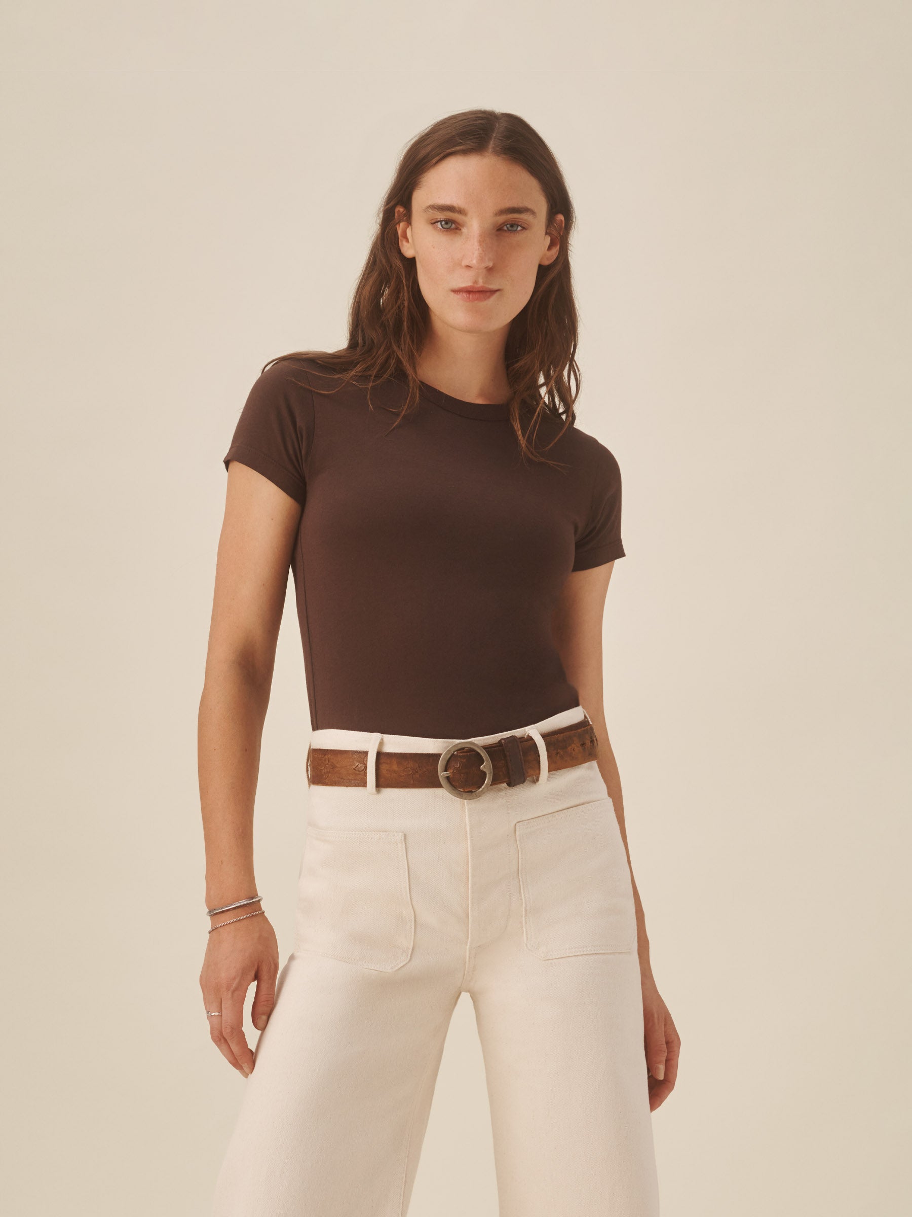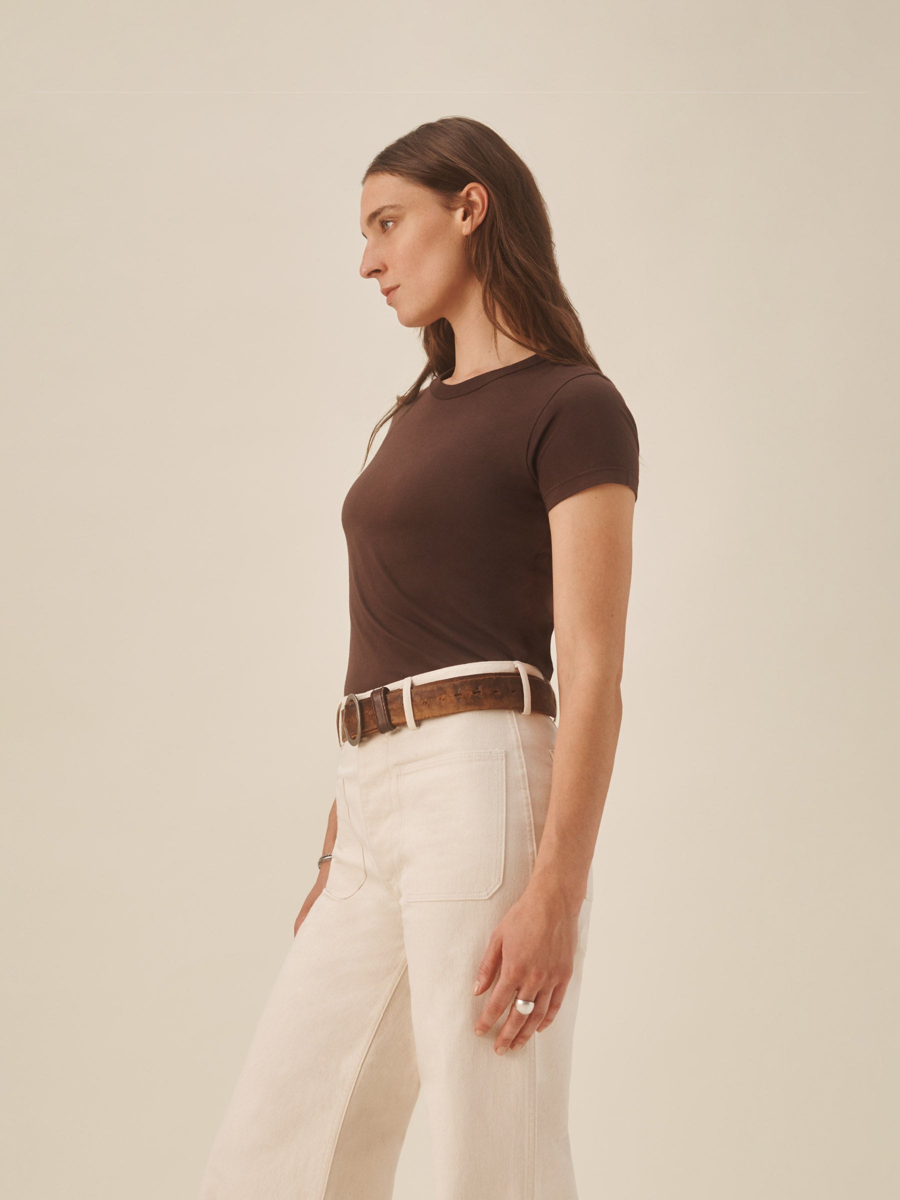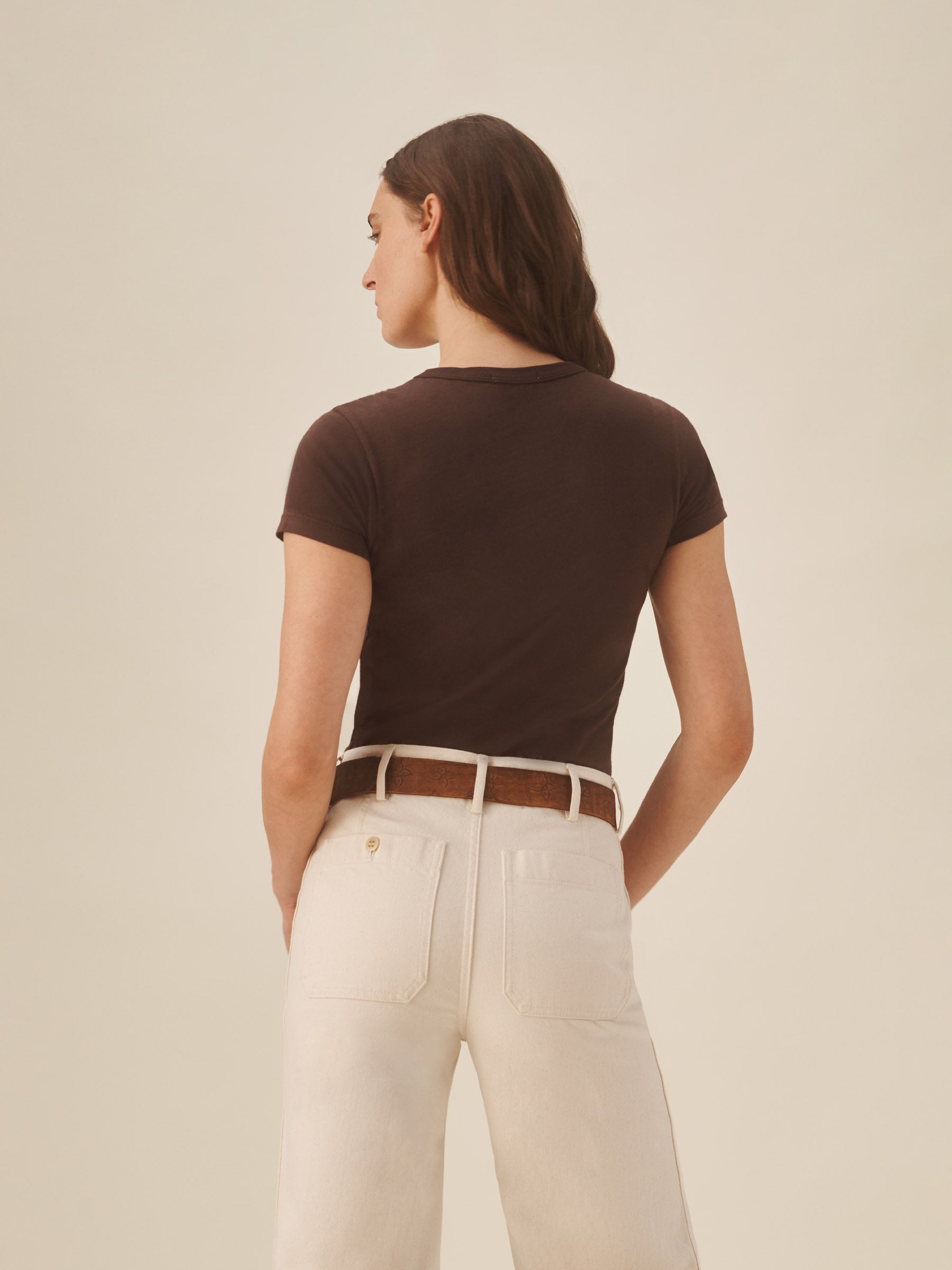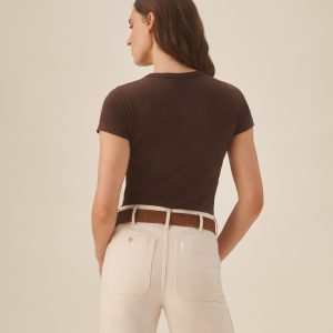 Slim fit short sleeve crewneck tee with a straight hem in 120 GSM jersey, knit from long-staple Supima cotton. Constructed with a durable rib stitch collar and double-needle cover stitch hem. Garment washed with softener for a lived-in feel.