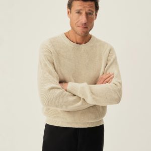 Classic fit crewneck sweater in a homespun textured cotton rib. Constructed with hand-linked seams, double layer ribbing at the collar, and racking stitch detailing at the cuffs.