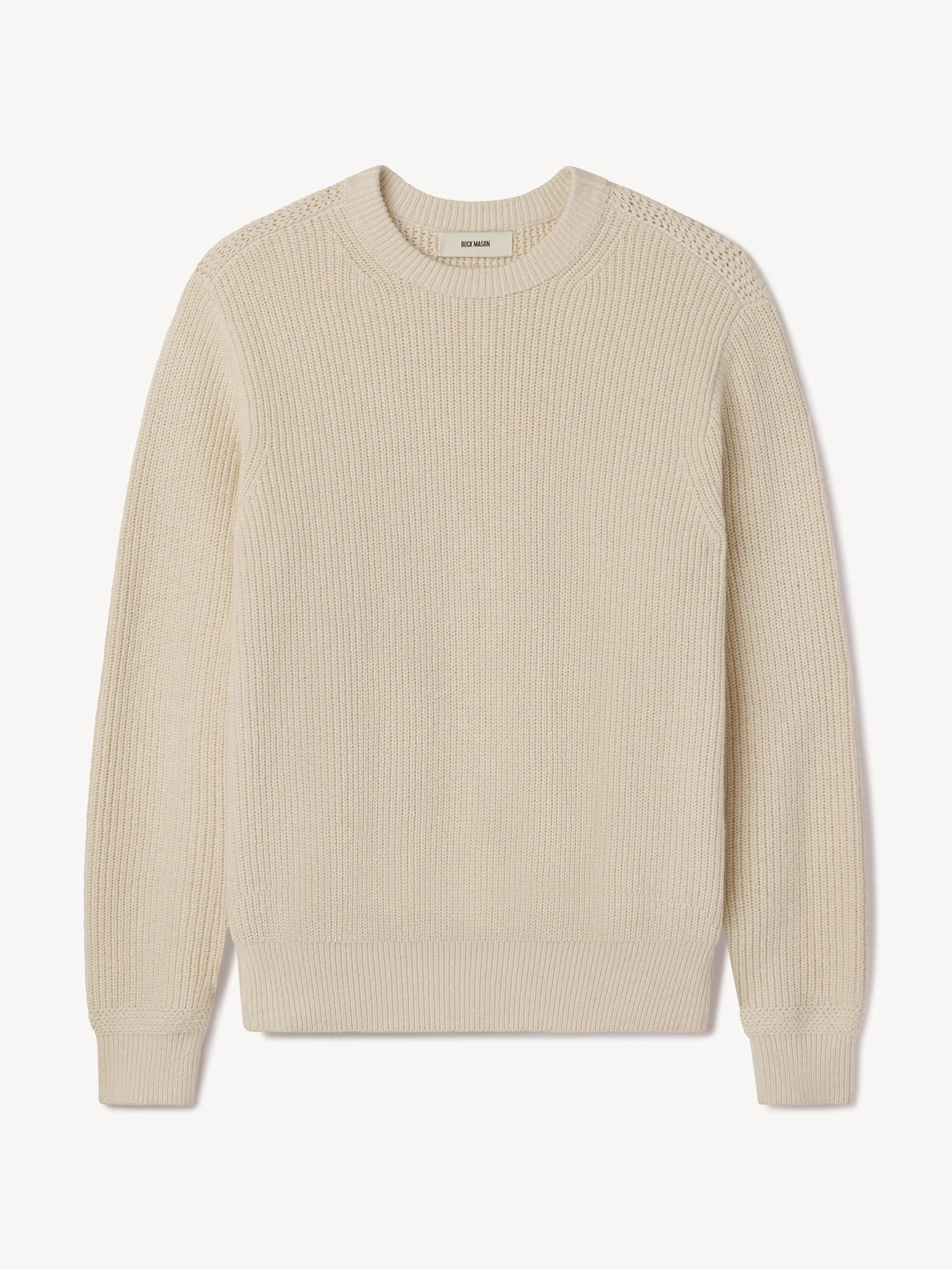 Classic fit crewneck sweater in a homespun textured cotton rib. Constructed with hand-linked seams, double layer ribbing at the collar, and racking stitch detailing at the cuffs.