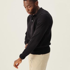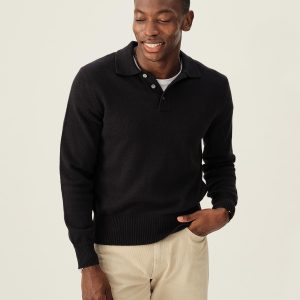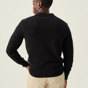 Classic fit polo sweater in a 7 gauge half cardigan rib knit from our homespun yarn-dyed cotton. Features a 3-button rib center front placket with nacre buttons and a rib collar designed to lay flat. Constructed with hand-linked seams and racking stitch detailing at the cuffs.