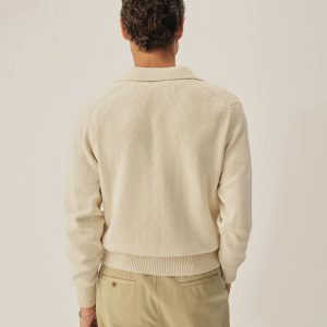 Classic fit polo sweater in a 7 gauge half cardigan rib knit from our homespun yarn-dyed cotton. Features a 3-button rib center front placket with nacre buttons and a rib collar designed to lay flat. Constructed with hand-linked seams and racking stitch detailing at the cuffs.