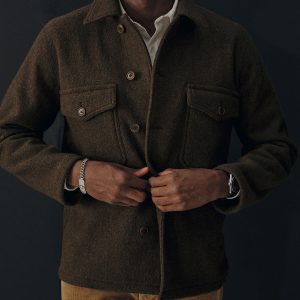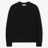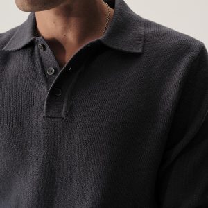 Classic fit polo sweater in a 7 gauge half cardigan rib knit from our homespun yarn-dyed cotton. Features a 3-button rib center front placket with nacre buttons and a rib collar designed to lay flat. Constructed with hand-linked seams and racking stitch detailing at the cuffs.