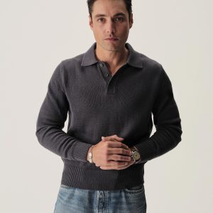 Classic fit polo sweater in a 7 gauge half cardigan rib knit from our homespun yarn-dyed cotton. Features a 3-button rib center front placket with nacre buttons and a rib collar designed to lay flat. Constructed with hand-linked seams and racking stitch detailing at the cuffs.