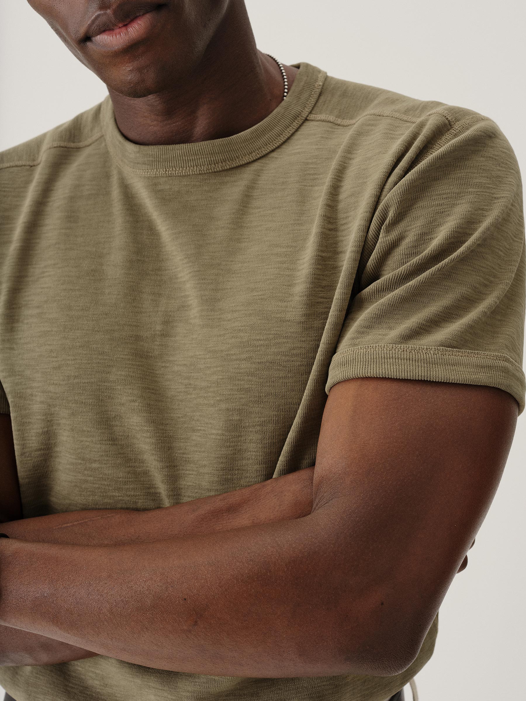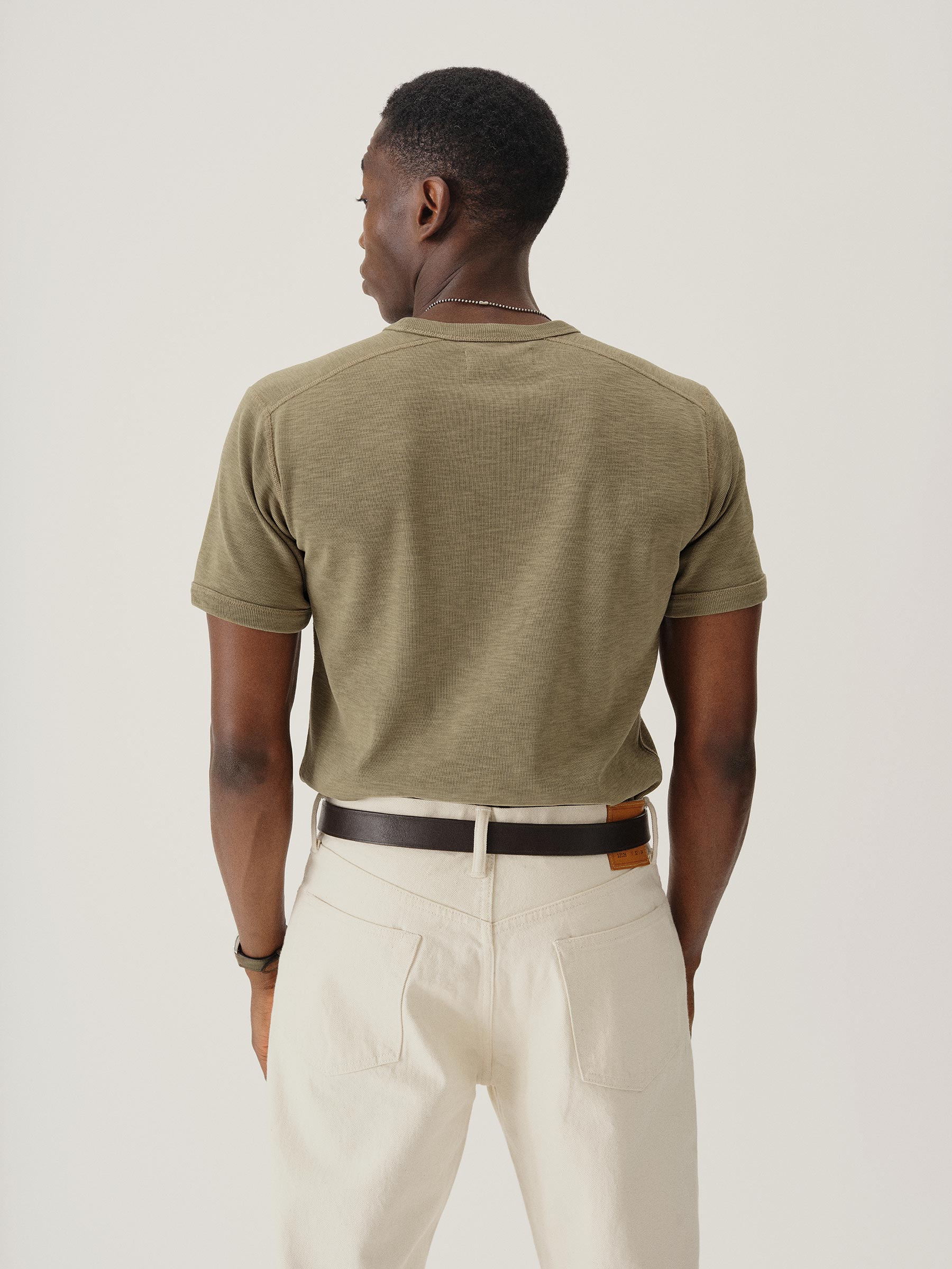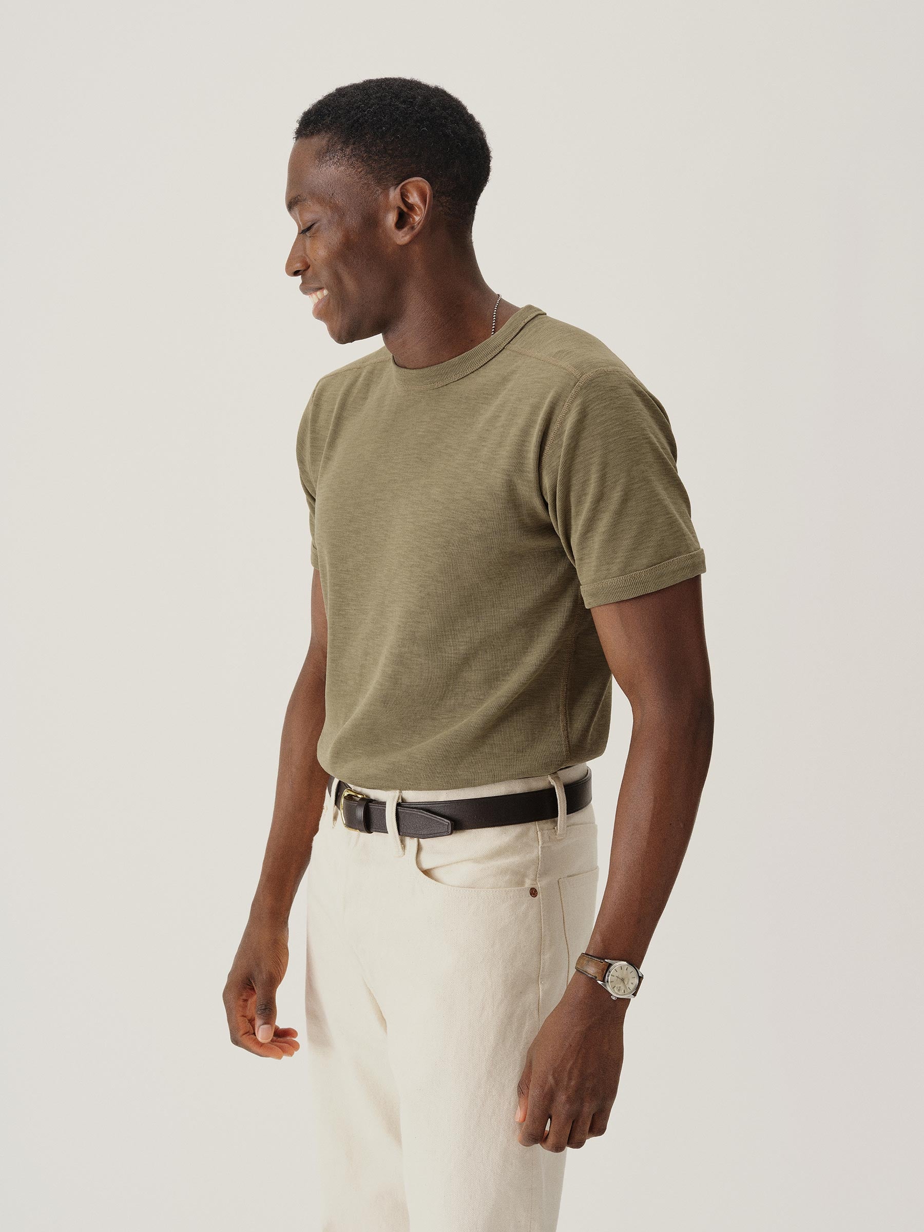 The Sidewinder is inspired by a tee first made a century ago to be worn beneath US military uniforms. When the heat was on, soldiers unbuttoned their top layers, and the tee took on the status we know today: as a garment worn proudly alone. Like the original, ours is crafted from substantial ribbed cotton that wears hard but breathes easy. We cut it for a classic fit that’s not too tight, not too loose.