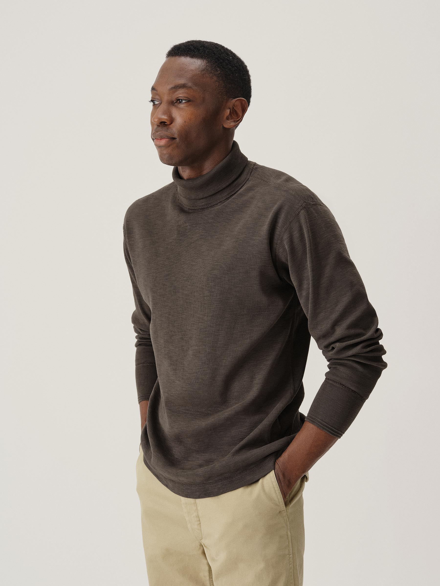 The Sidewinder is inspired by a tee first made a century ago to be worn beneath US military uniforms. When the heat was on, soldiers unbuttoned their layers, and the tee took on the status we know today: as a garment worn proudly alone. Reinterpreted as a turtleneck, this heavyweight piece is crafted in the same breathable ribbed cotton as the original. We kept the dialed-in vintage fit for extra range of motion.