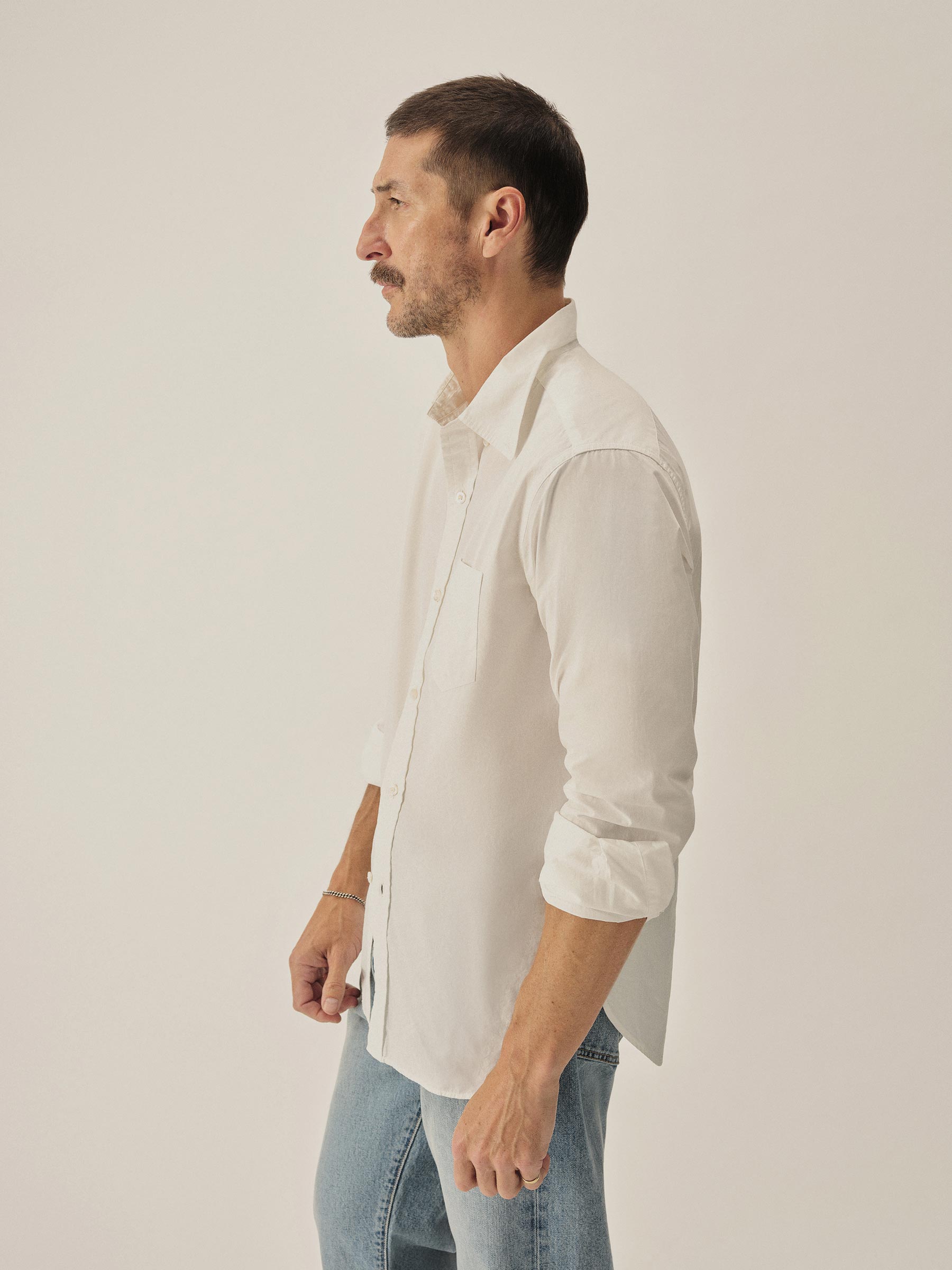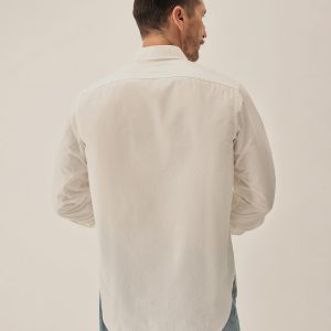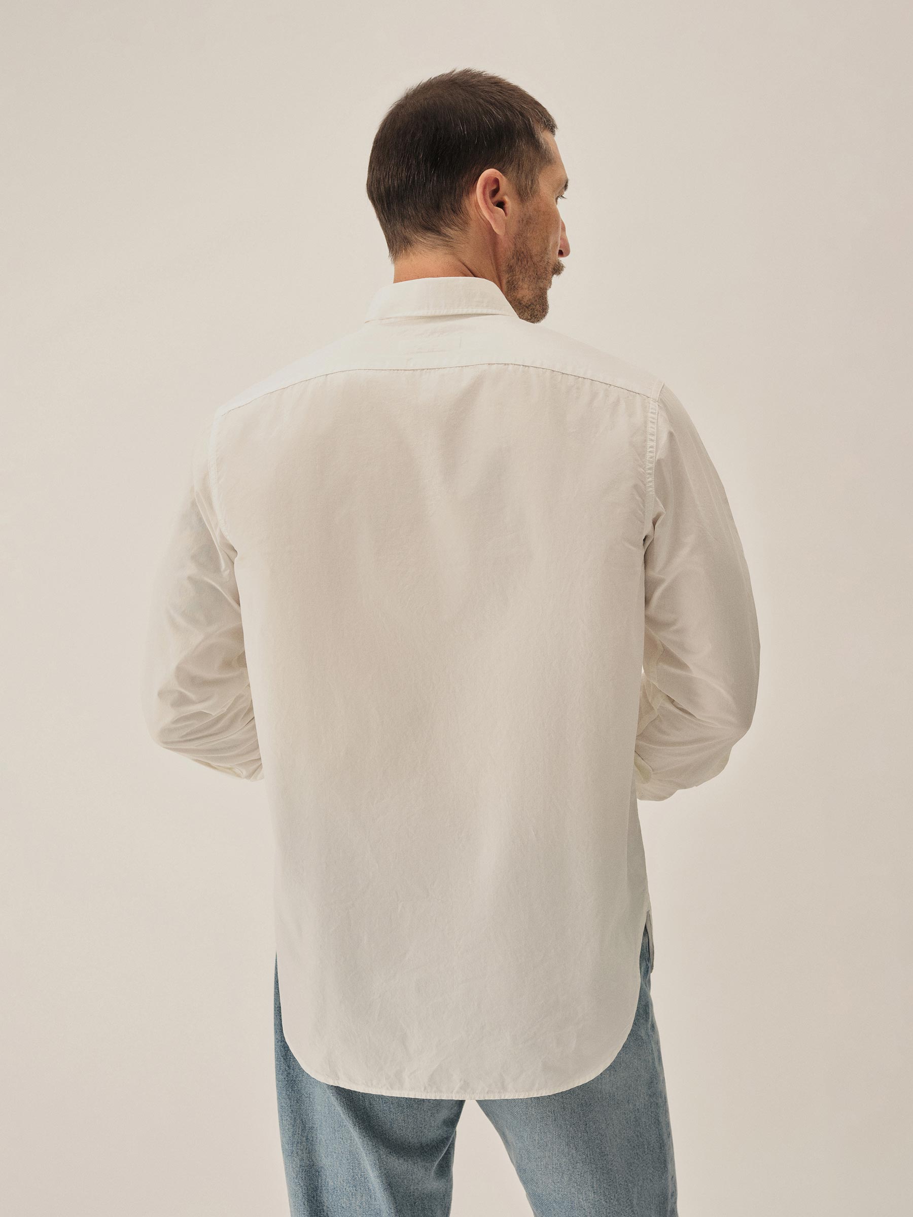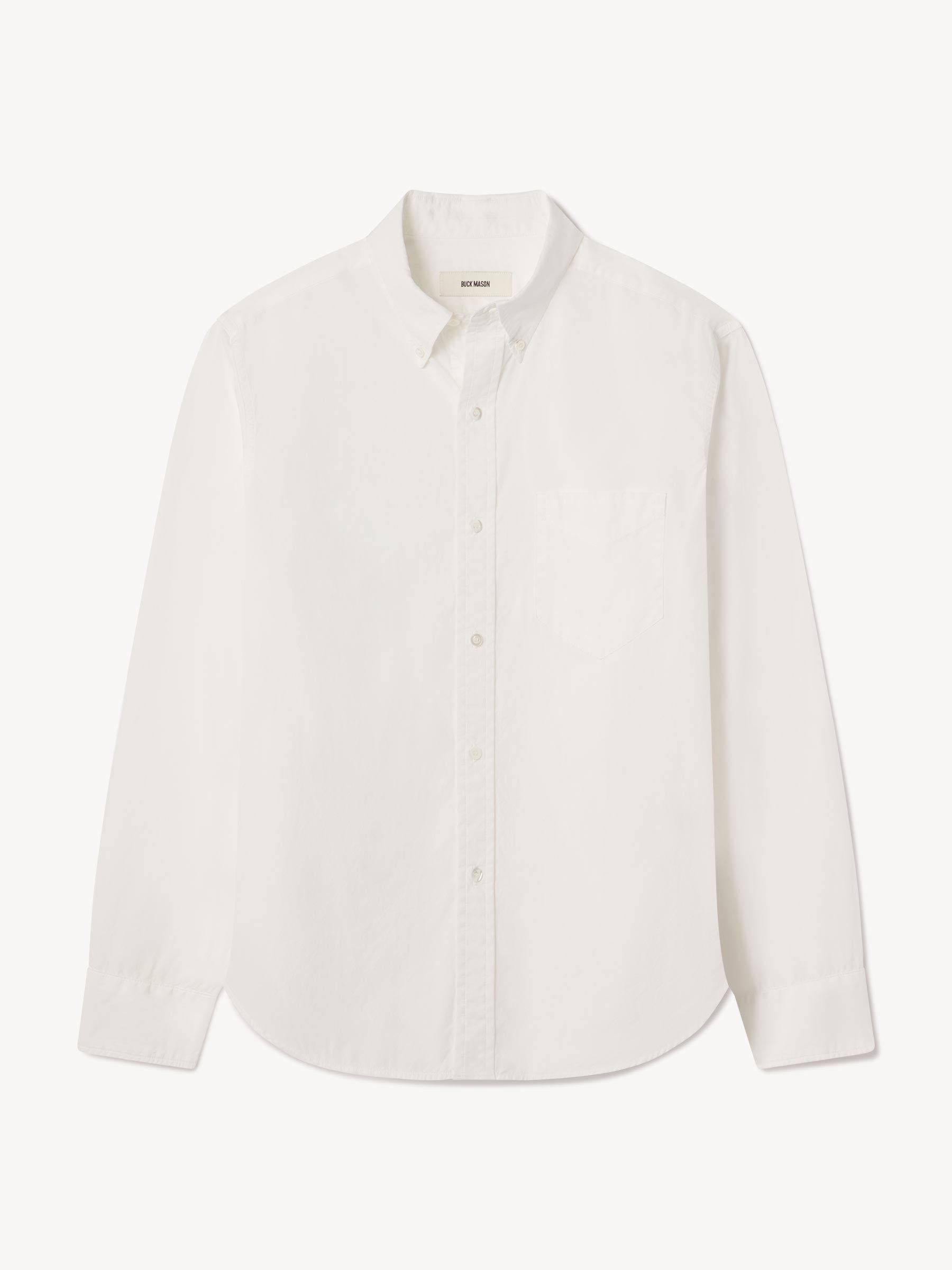 Classic fit button down collar shirt cut from a featherlight 3 oz cotton poplin. Details include mother of pearl buttons, a single scallop pocket, and a box pleat at the back. Constructed with clean finished seams. Garment washed for a lived-in look and feel.