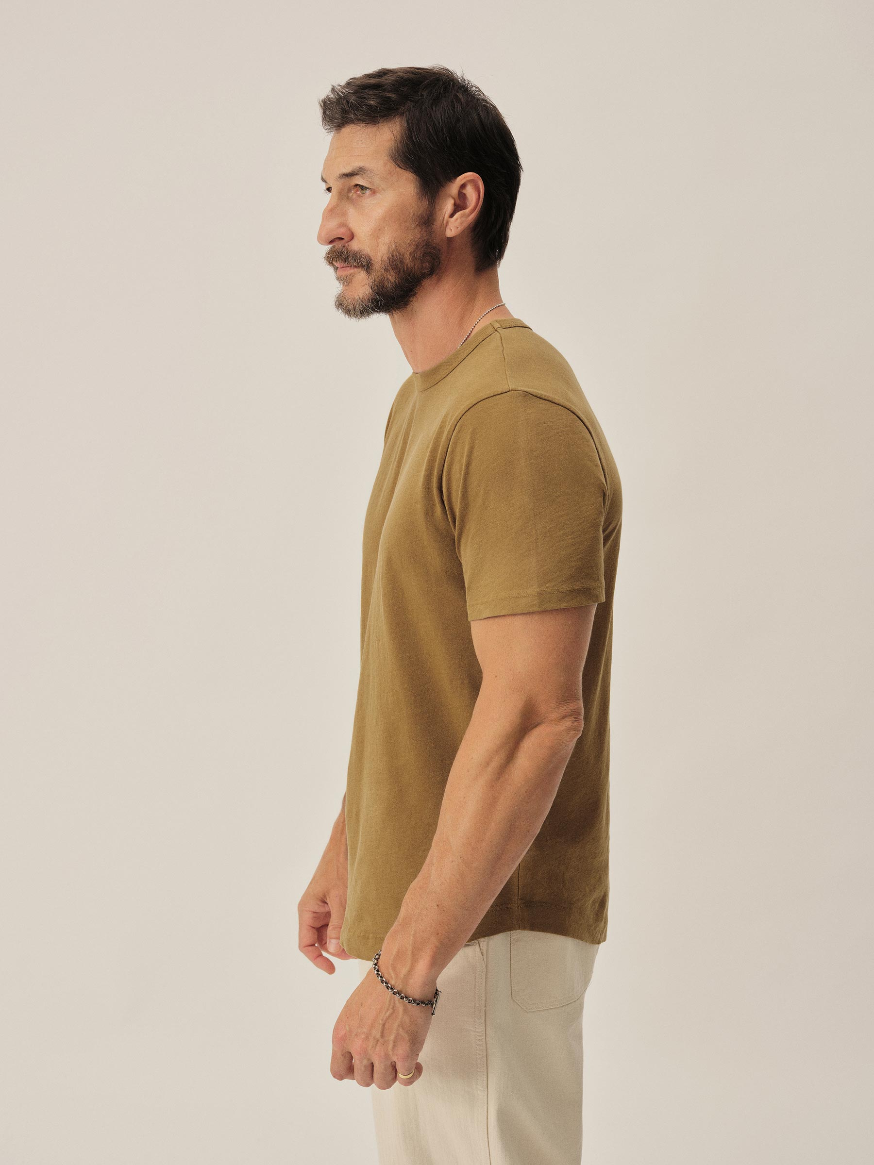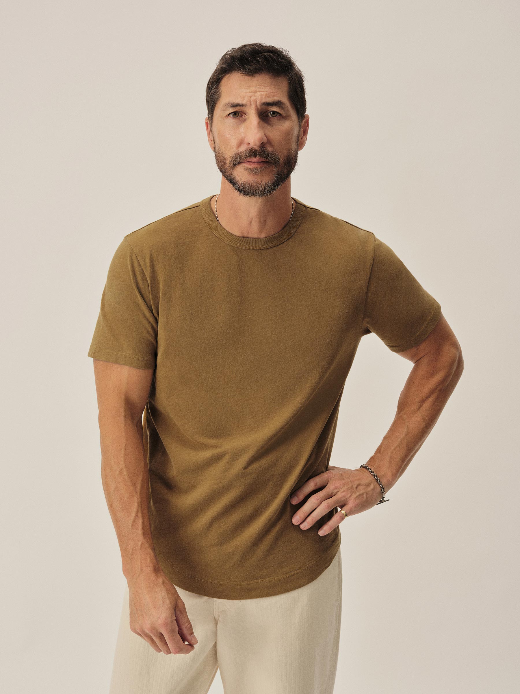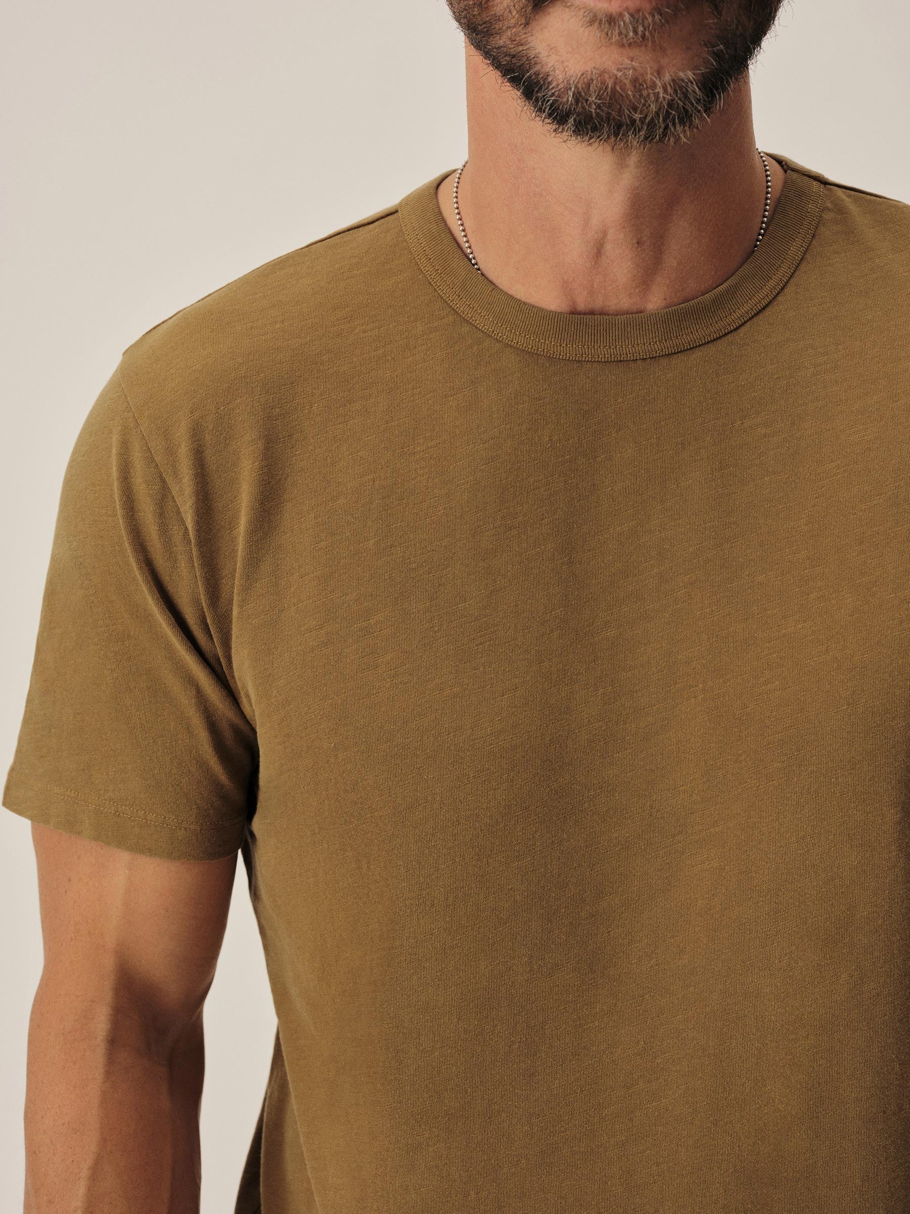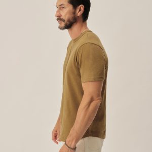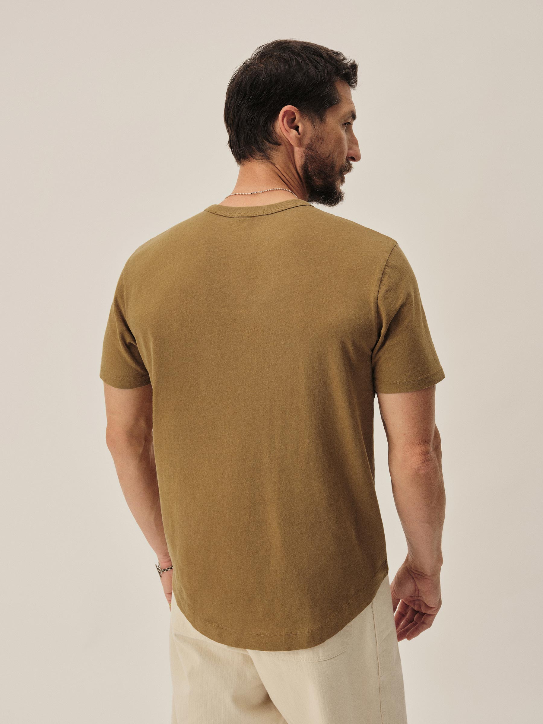 Classic fit short sleeve crewneck tee with our signature curved hem, cut from USA grown 145 GSM cotton with a light slub texture and sewn at BM Knitting Mills in Mohnton, PA. Constructed with self-neck binding and a flat stitch finish for comfort. Garment washed with enzymes and softener for a lived-in feel.