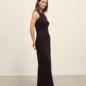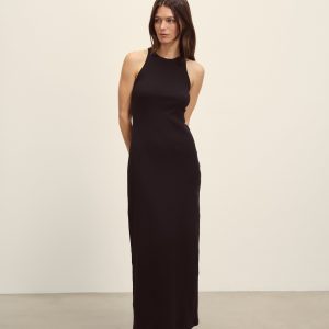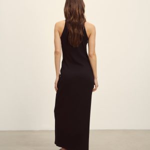 Slim fit tank dress that falls straight from the hip to hit below the calf in a 54″ length. An easy silhouette in 295 GSM stretch cotton that holds its shape. 2×2 rib structure—two rows of rib stitch, two rows of jersey stitch—is offset by contrast 1×1 ribbing at the neck. Features a hidden thread chain and snap at each shoulder to hold bra straps in place. Constructed with flatlock stitching throughout and double needle coverstitching at the hem. Garment washed for a lived-in feel.