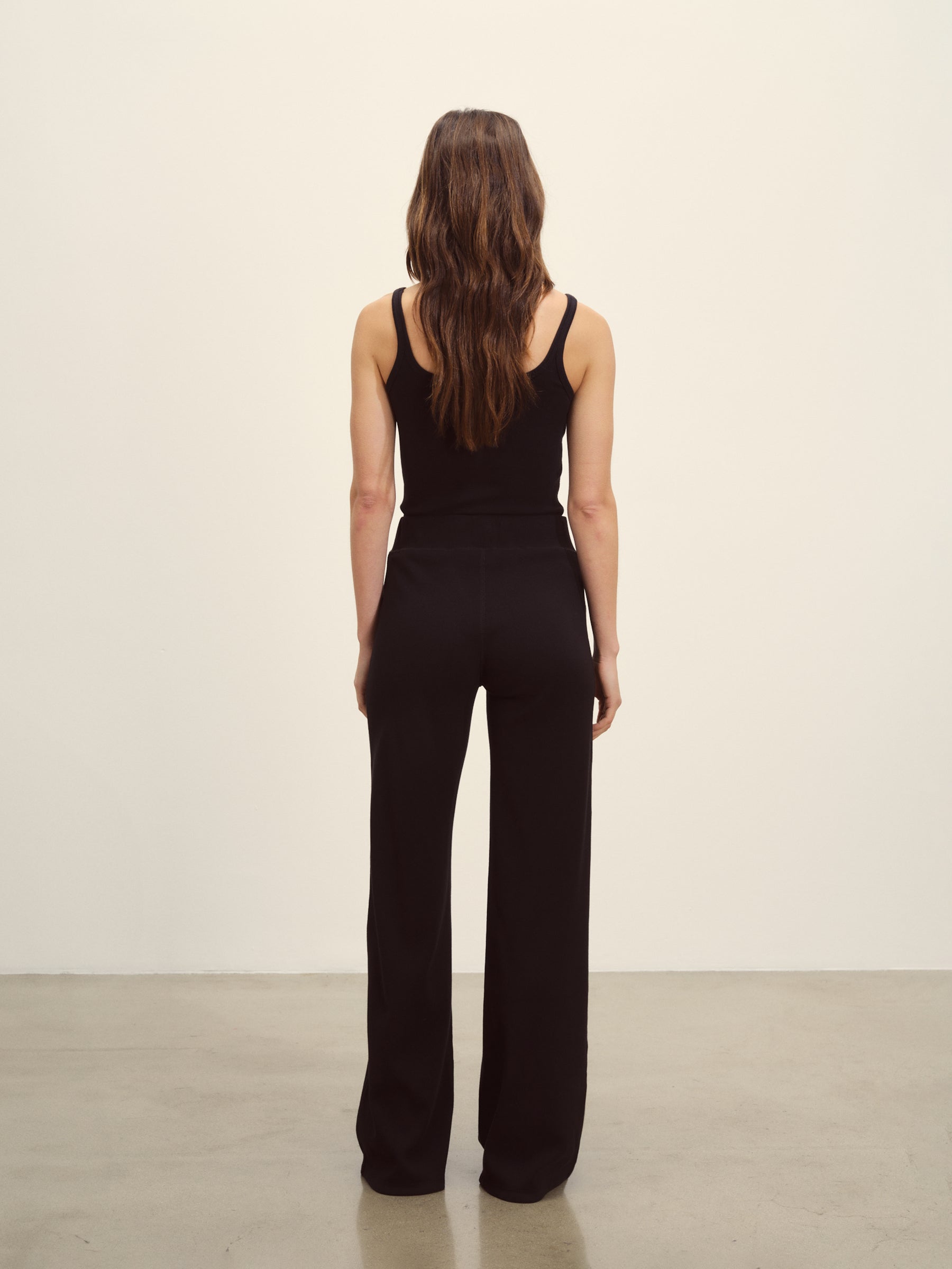 Straight leg, high-waisted 2×2 rib knit pant cut from 295 GSM stretch cotton that holds it shape. Fits comfortably at the waist with a wide elastic waistband with a full length inseam measuring 31 3/4”. Garment washed for a lived-in feel.