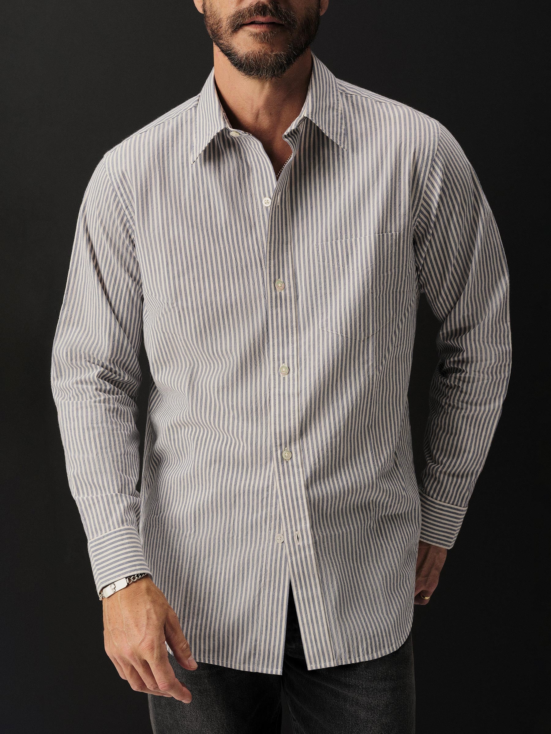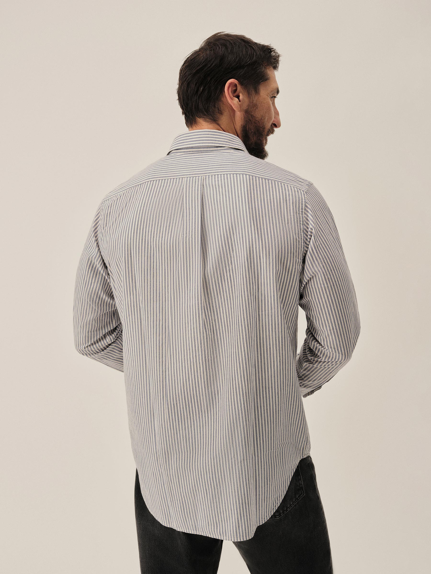 Slim fit long sleeve button-up cut from 4 oz. washed cotton. Details include a button placket, a single spade pocket at the chest, and a box pleat at the back yoke. Constructed with single needle topstitch detailing with double needle stitching at the collar and cuffs.