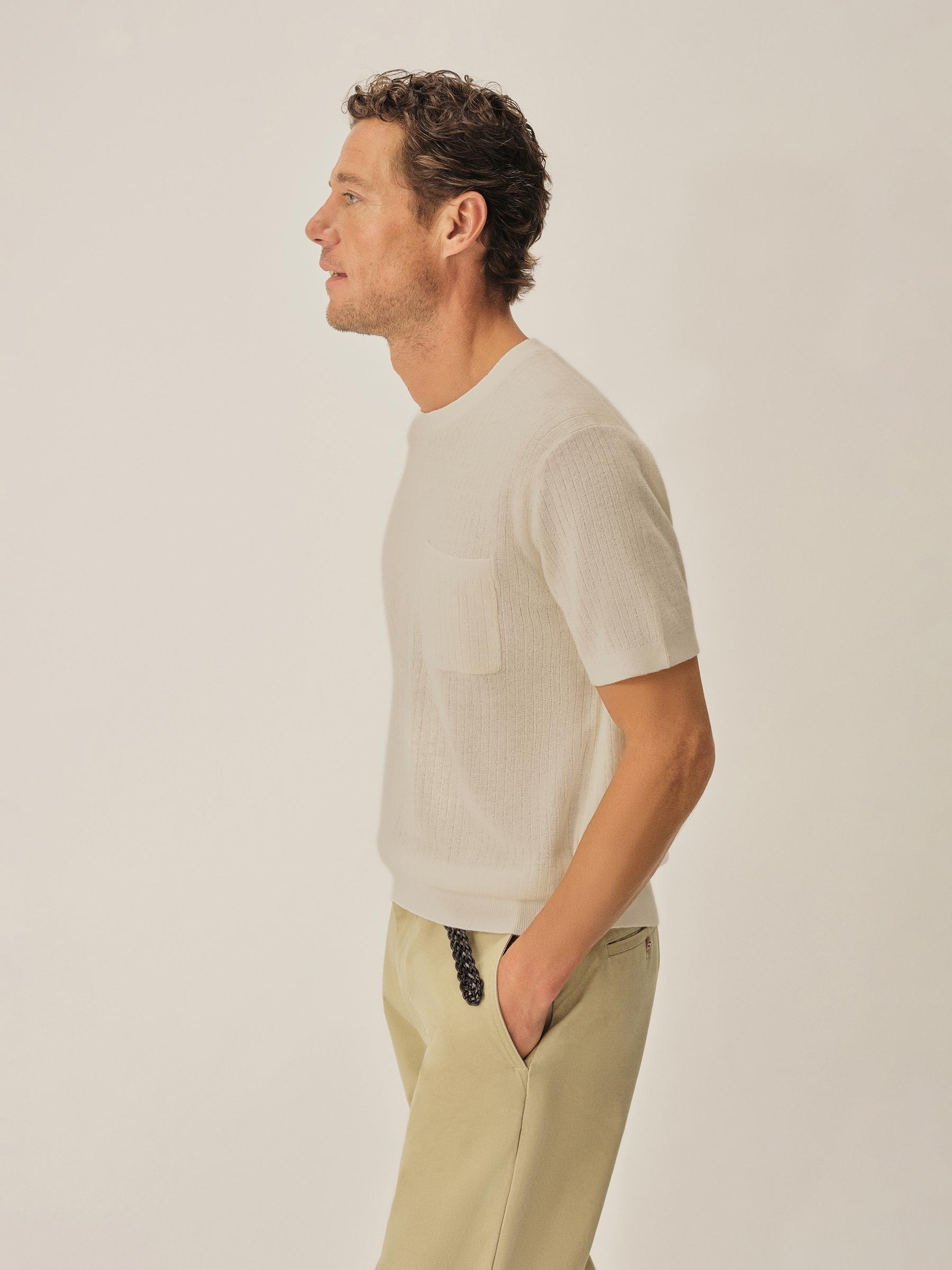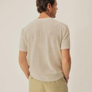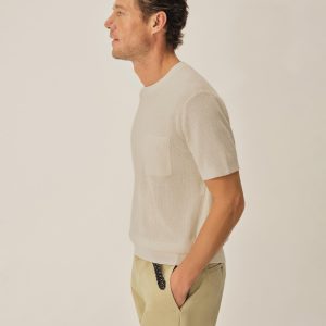 A classic fit tee in a fine knit drop-needle rib construction. Made from 12 gauge yarn-dyed hemp/cotton blend that wicks moisture and breathes easily. Chest pocket with ribbed opening. Finished with a 1×1 rib at collar, cuffs and waistband. A versatile summer layer inspired by vintage rib tees.